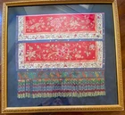 A most unusual piece with very fine Forbidden Stitch embroidery on silk. It is finished at the bottom with a beautiful, beaded trim showing fish and long tassels. It is very well framed in a dark blue shadow box with an elegant gilt wood frame. The condition is excellent. The textile has aged and shows some fading. The beaded section has some damage as pictured. The frame is in excellent shape. Framed Piece: 25” x 26” Textile Piece: 19” x 20”