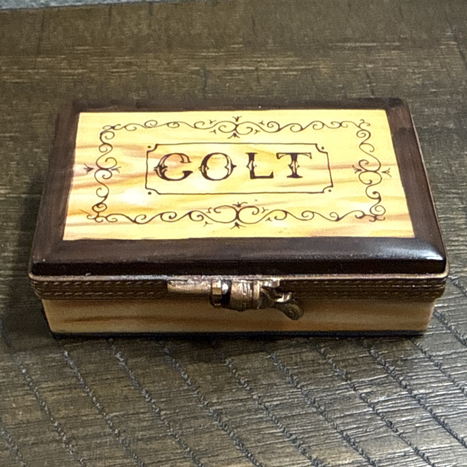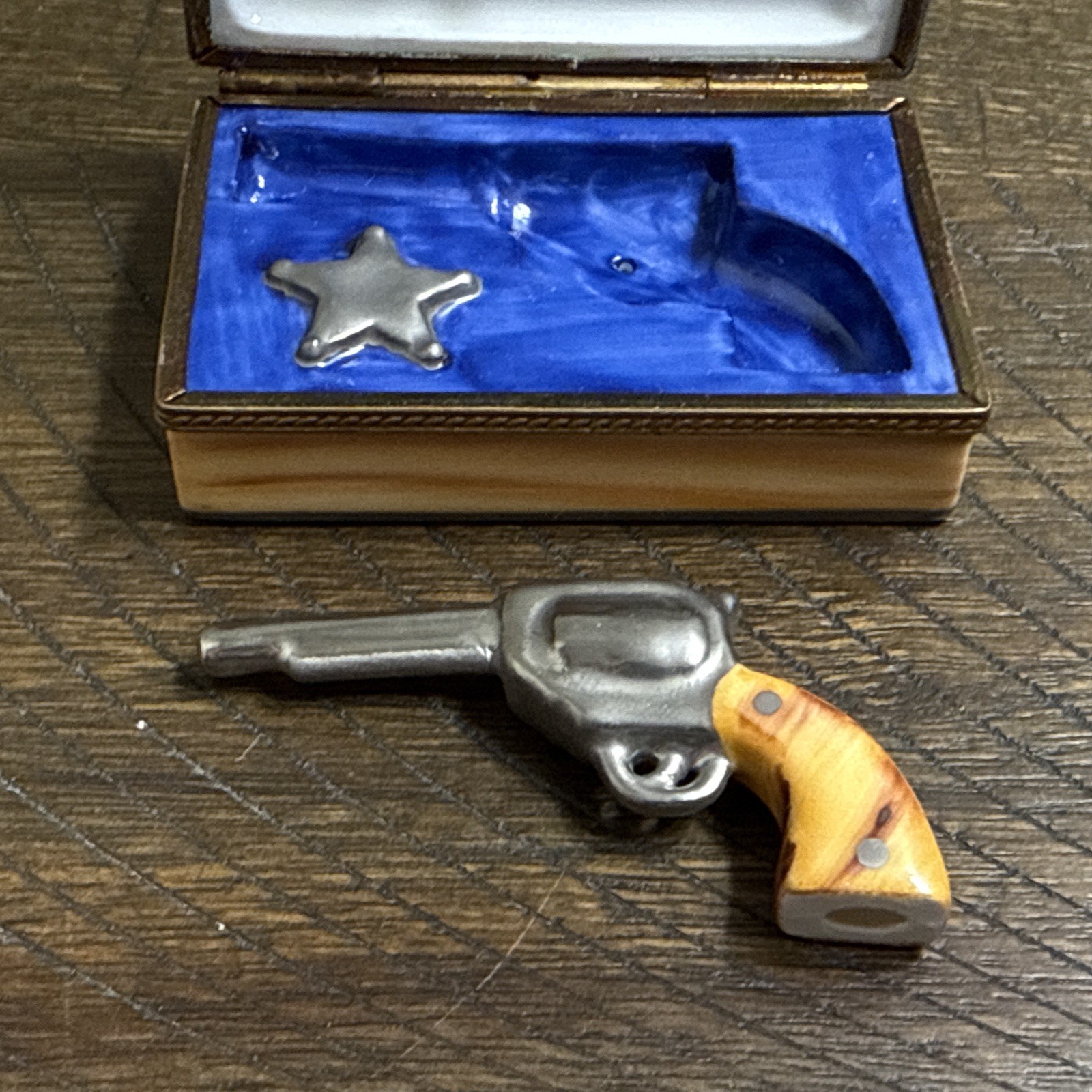 Great Condition. See photos. There is some green showing as shown in photos. I’m not sure if this is from oxidation from the metal or paint. See photos. This is a very rare piece, especially to have the gun trinket to go with it. I was told it is New Old Stock from a dealers inventory that has been in storage since the 1990s. Hand Painted - Limoges France
