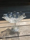 Glowing Gorgeous Antique Paneled Thistle/Delta HIGBEE Eight Paneled Pedestal Bowl. 7 1/" tall, rim 7 1/4" diameter, base 3 3/4". Unmarked. The base and the sawtooth scalloped rim glow, as well as the thick panel separators. There is, what seems to be a production flaw on 1 of the thick panel separators. It does not take away the beauty of this piece. Please refer to my photos. Panels extend to the base.