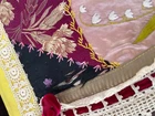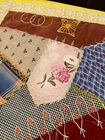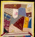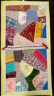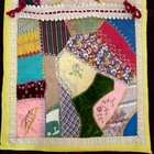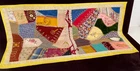 A stunning panel hand made in crazy quilt piece consisting of two square sections, with hand-embroidered decoration, joined in the center by a length of lace with a velvet ribbon strung through the lace openings. Lace frame both sections. The backing is a plaid silk. The condition is overall very good for a crazy quilt. Two silk sections, one green and the other black, have frayed and there is a split in the plaid backing fabric where it joins the front (see photographs). 19-1/2" wide x 37" tall