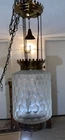 **No original pieces of this lamp have been altered for the "conversion" to accept electric. Cord was simply fed through an existing hole. Antique Hanging Oil Hall Lamp, Brass with Finger Lamp, Etched Shade with non-intrusive electric conversion. Brass is a beautiful floral design (tulips?) with flower shaped finger screws to complete. Brass has no peeling or rust and the rise & fall does work. Electrified without any structural modification to lamp that can easily be reversed. (Original 8 in chain still present too.) Chain/cord approximately 20' long total with inline switch. Frosted shade has BB sized hole on top with local 1" hairline crack. Etching of sphinx, pyramid, woman repeats once around glass. Shade itself is 8 inches wide and 10 1/2 in (showing) tall. Clear glass finger oil lamp has no chips or cracks and has an Eagle Burner (takes 3" chimney not included) / "P&A Mfg Co Waterbury CONN Made In U.S.A." on dial that works as it should. Elongated bulb included but longevity unpredictable. Glass will be removed for safe shipping...3 boxes inside of one. No international orders. Please review all actual item pictures to further describe condition and to show any other imperfections. Comes from a smoke free, pet free home. Along with "recycling" items of yesteryear, I emphasize the importance of environmental safety and not abusing our Earth's natural resources. Recycled materials may be used when packing merchandise and will not compromise the integrity of safe delivery. 16#23x22x15