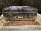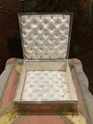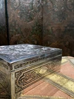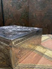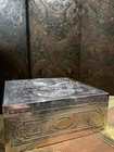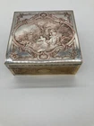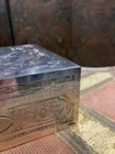 This is a beautiful Antique silvered copper French Jewellery Casket, engraved by by the famous French engraver B.Wicker, Paris C 1880's. This wonderful casket is of very high quality and features superb engraved decoration set in panels of classical scenes. The hinged lid is decorated with a stunning engraved image entitled 'Le Denicheur de Moineaux ' , after an engraving by the great french artist François Boucher . Ornamented on each side with very intricate details and a high quality engraving . This square shape jewelry box measures 7'' by 7'' and 3'' height . Beautifully lined up interior . Good antique condition , loss to the silver plating , some tarnish , surface scratches and some stains to the interior fabrics . Please take a look at the pictures and do not hesitate to reach out for additional information Will be quickly shipped and well packaged