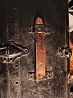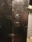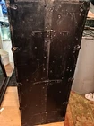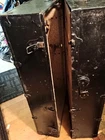 This antique travel chest from the 1920s is a unique addition to any furniture collection. Made of wood with a black painted finish, it features a brass handle and a folding door mechanism. The chest is 38 1/4 inches in length, 22 1/2 inches in width, and 8 1/4 inches in depth, making it perfect for storage and travel. The chest has four drawers, each with a solid pattern and no tools required to use. It is free-standing and requires oil treatment for care instructions. The military theme and antique design make it a great choice for anyone looking for a unique piece of furniture. This chest is suitable for teens, boys, adult, girls, and unisex kids. It has normal wear and tear. The leather handle is broken as shown in picture.