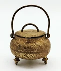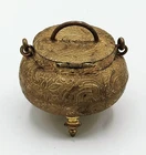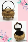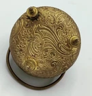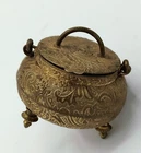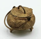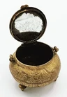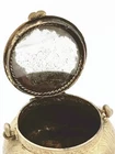 Antique Victorian Hinged Patch Box with Mirror Kettle Shape Repoussé French I was told this is most likely made in France, quite an unusual shape for a beauty patch box, these held little stickers that a woman would put on their face to accent their white skin or hide a blemish, creating a beauty spot!. Some would be stars, hearts, flowers.......I have sold the art deco face patch stickers before. cute kettle shape with bale handle and sits on 3 feet, hinged lid with mirror on inside of lid. the kettle part (not counting upturned handle) is 1-1/2" tall x 1-3/4" across. the mirror measures 1" diameter Overall beautiful condition for age......the mirror does have some silvering (please view picture where I lightened the photo so you can see it better. there are no dings or dents in the metal, and no cracks in the mirror if you have any questions, please message me Thanks for viewing!