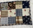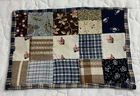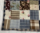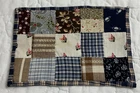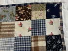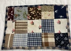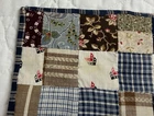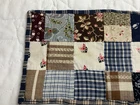 Up for sale is an antique/vintage patchwork country quilt table topper. The design is four patch. The fabrics are very early calico prints, florals, shirting fabrics, stripes, dots, checks. This table topper is made from an antique quilt top from the late 1800’s to early 1900’s. The colors are brown, white, navy blue, dark beige, brown, blue, black, multi. The border is navy blue check, hand sewn. The back is navy blue dot check. Tacked at center. Medium thickness. Very, very good condition. Measures 5 1/2” by 7 3/4”. Cotton. Hand made. Made in USA. Vintage/antique table topper cut down from an antique quilt top. Border and back fabric is not vintage. Not hand quilted. A few age spots. 💗💗💗🌼🌻 Thanks and happy shopping. I will combine shipping charges. Smoke free home. Please make payment in three days ~~~~🌹🌻🌷Please visit my eBay store: 🇺🇸webbsamericancountry1🇺🇸 for over 2000 vintage and collectible items.~~~~🌺🌼🌹