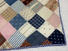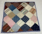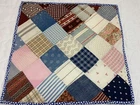 Up for sale is an antique/vintage patchwork country quilt table topper, doll quilt or teddy bear quilt. The design is four patch. The squares measure 2 1/4” by 2 1/4”. The fabrics are early calico prints, dots, stripes, checks, florals, prints. Very nice early calico prints. The colors are navy blue, white, medium blue, pink, brown, rust, beige, light pink, black, grey, multi. The back is royal blue and white floral calico print fabric. The border is royal blue and white floral calico print fabric, hand sewn, Hand bound. Medium thickness. This quilt piece is cut down from a vintage/antique patchwork quilt top, early 1900’s. Cotton. Measures 12” by 12 1/2”. Tacked at center. Very, very good condition. A couple of very minor age spots. Hand made. Made in USA. 💗💗💗 Thanks and happy shopping. I will combine shipping charges. Smoke free home. Please make payment in three days ~~~~🌹🌻🌷Please visit my eBay store: 🇺🇸webbsamericancountry1🇺🇸 for over 2000 vintage and collectible items.~~~~🌺🌼🌹
