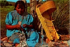 Apache Bead Maker with Traditional Native American Cradleboard Postcard 24233 Front of Card: The image shows a person sitting on the ground outdoors, engaged in what appears to be a traditional craft activity. The person is wearing a blue dress with intricate patterns and is holding a piece of fabric or ribbon. There is a woven basket-like structure, possibly a cradleboard, leaning against a tree next to the person. The background includes green vegetation and a tree trunk, suggesting a natural setting. This image is interesting and relevant as it depicts traditional craftsmanship and cultural attire, highlighting the importance of preserving and showcasing cultural heritage and practices. Back of Card: The image is a postcard with text on it. The text reads: APACHE BEAD MAKER A skilled worker displays her necklaces, ties, belts, hat bands and medallions made from glass beads. She also shows an Apache cradleboard made from sotol blossom stalks, pine striplings, and pinon pine pitch. Most boards today are completed with denim rather than buckskin. Photography by Western Ways Features There is also a logo that reads "Petley" and additional text along the side that reads "Pub. by Petley Studios, 4051 E. Van Buren, Phoenix, Arizona." At the bottom, there is text that reads "74006-B" and "MADE BY DEXTER PRESS, INC." This image showcases traditional Apache beadwork and craftsmanship.