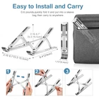 [Adjustable Angle] - Our laptop stand offers 6 adjustable pointing sites, adjust the height to your comfort level, so that you could feel some relief from back/shoulder/neck/arm pain caused by inappropriate postures. [Compatibility] - 9 to 15.6 inches devices such as Macbook (Air, Pro), iPad Air 2/3/4,iPad Pro 2/3/4 and more, could be work as phone holder as well. [Material] - This laptop stand is made of aluminum alloy, sturdy and could support laptop that up to 44 lbs (20 kg). Non sticky and high quality aluminum allow easy clean and rust-proof function. [Anti-slip and heat dissipation] - The anti-slip rubber pad on the laptop stand could keep them from sliding away and help them to stay still. By prop up laptop, heat dissipation will be speed up, much better and faster than non stand laptop. [Fold-able and Lightweight] - Only weighted 245g (0.54 lbs) , could be folded to size of 10*1.77*0.8’’, pretty small, easy to carry with provided pouch. Please tell us if you have any product related problem, we are more than happy to resolve any issues for you.