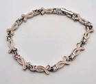 Show your support for breast cancer awareness with this stunning silver tone bracelet from Avon. Adorned with pink rhinestones and enamel pink ribbons, this bracelet is in great condition. Bracelet is 7” long & has 1.5“ extra link extender (if you need longer length)