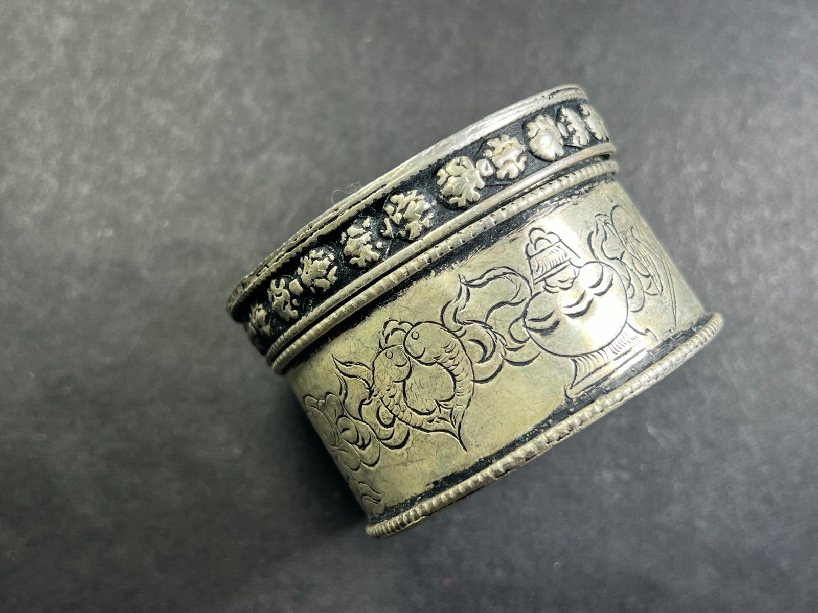 USPS/UPS No long wait Product SHIPPED FROM the USA Just 5 to 6 days delivery time at a competitive price. Love the item but not the price? Make me an offer. No reasonable offer refused. Handmade Ashtamangala Silver Plated Lucky Sign Trinket Jewelry Box - Tibetan Silver from Patan, Nepal No More in the Production Item Description: This beautifully crafted trinket box is a unique piece of art, meticulously handmade by skilled artisans from the historic city of Patan, Nepal. The box is adorned with Ashtamangala symbols, which are considered sacred and bring good fortune and prosperity according to Tibetan and Buddhist traditions. The box is made from Tibetan Silver (also known as German Silver or White Metal), a durable alloy known for its lustrous, bright finish and resistance to tarnishing. With its intricate craftsmanship and spiritual significance, this box makes an ideal keepsake or a thoughtful gift for someone special. What is Ashtamangala? Ashtamangala refers to the "Eight Auspicious Symbols" in Tibetan Buddhism, which represent various aspects of good fortune, spiritual development, and blessings. These symbols include the conch shell, lotus flower, wheel of Dharma, endless knot, treasure vase, pair of fish, victory banner, and the umbrella. Together, they signify harmony, prosperity, and well-being. Key Features: - Material: Tibetan Silver (also known as German Silver or White Metal) - Design: Ashtamangala symbols for good luck and prosperity - Craftsmanship: Handmade by artisans from Patan, Nepal - Size: - Height: 1.8 inches - Length: 3 inches - Width: 2.3 inches - Weight: Approx. 54 grams - Use: Perfect for storing small jewelry, trinkets, or as a decorative item in your home or office - Unique: A rare, culturally significant piece of craftsmanship from Nepal Condition: Brand New, Handmade Shipping & Handling: - Fast and secure shipping options available. - We take great care in packaging to ensure your item arrives safely. Why Buy From Us? - Authentic handmade products from Patan, Nepal. - High-quality craftsmanship using traditional techniques. - Perfect gift for collectors, those who appreciate cultural art, or anyone interested in spiritual symbolism. Add a touch of cultural heritage and good luck to your home with this stunning Ashtamangala Silver Plated Trinket Jewelry Box! (B66/GCA/Sec A) FOR WHOLESALE CONTACT US Buying handmade products comes with a range of benefits that can be quite compelling. Environmentally Friendly : Handmade items generally have a lower environmental impact compared to mass-produced goods. They often require fewer resources and less energy to create. Additionally, small-scale production usually involves less waste and fewer pollutants. Better for the Economy : Purchasing handmade products supports local artisans and small businesses. This not only helps create jobs but also keeps money within the community, which can contribute to a more robust local economy. Purchases You Can Feel Good About : Buying handmade can give you a sense of satisfaction knowing that your purchase supports individual creators and ethical practices. It often involves fair trade practices and contributes to sustainable economic development. You Will Feel the Human Touch : Handmade items often carry a unique personal touch that mass-produced items lack. The craftsmanship and attention to detail in handmade products reflect the skill and passion of the maker, making each piece distinct and special. Value Over Time : Handmade products, particularly those that are well-crafted, can appreciate in value over time. For example, antiques or heirloom-quality items often gain sentimental and monetary value as they age, making them potentially valuable investments. Overall, choosing handmade products can lead to a more thoughtful, sustainable, and rewarding shopping experience.
