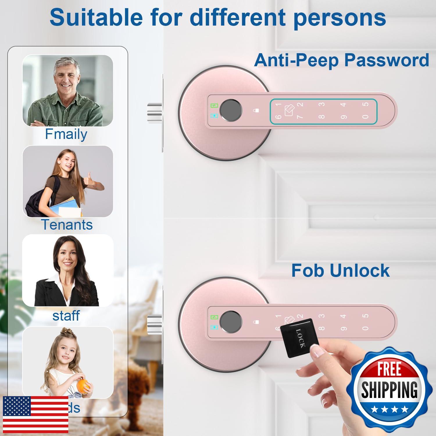 BAFUWEIY Fingerprint Door Lock, 6-in-1 Smart Door Knob with App Control/Fingerprints/IC Cards/Passwords/2 Keys, Fingerprint Door Knob Biometric Door Lock for Bedroom Apartment-Pink Features 【Various convenient ways to unlock】6-in-1 Fingerprint Door Lock : Smart Life APP Control + 100 Fingerprints + 100 Passcodes + 100 IC Cards + 2 Mechanial Key. Meanwhile Alexa and Google Assistant voice control can be used by connecting the gateway (sold separately); 【Smart App Remote Control】 Fingerprint door knob supports App to control all functions. Adding fingerprints/passwords, sharing temporary passwords, checking records, members' sharing. After pairing with gateway (sold separately), you can control the door lock easily and quickly anytime and anywhere; 【More Advanced and Convenient】Smart door locks can be voice controlled and are compatible with Alexa and Google Assistant. Our fingerprint reader has 25,600 pixel points for a more accurate and faster recognition rate, increasing the security of your home; 【Easy Installation】Fits most standard American single cylinder doors. We also provide instructions, installation and setup videos. Installation is very easy, only need a screwdriver (included), no additional drilling required. 【Reliable Emergency Charging】When there is no power, our smart lock will low battery alert. And it also has emergency charging Type-C port (no power storage function, only emergency unlocking). If you have any problem, pls feel free to tell me, we will try my best to solve it. Shipping Free & Fast Shipping: We offer free shipping to most of the USA with a normal delivery time of 3-7 days. However, due to the current situation, additional delivery time (up to 3 weeks) may be required for some items. Alternative Carriers: We may use alternative carriers (e.g., USPS, FedEx, UPS) to ensure your package arrives safely and on time. Due to the use of multiple carriers, we are unable to provide a tracking number automatically. Handling Time: Orders are processed and shipped within 1-2 business days of receiving cleared payment. Shipping Restrictions: Shipping to Alaska, Hawaii, Puerto Rico, Guam, and other US territories may incur shipping charges or delivery restrictions. Please contact us before ordering, or your order can be refunded/cancelled. State Restrictions: Certain items may not be shipped to California due to state regulations. Contact for Tracking Updates: If you require tracking updates or have any concerns about the delivery of your order, please feel free to contact us, and we will be happy to assist you. Return Policy 30-Day Hassle-Free Returns: If you are not completely satisfied with your purchase, you can return the item for free within 30 days of receiving it for a full refund or exchange. Easy Return Process: Contact us, and we will provide you with a prepaid return shipping label and detailed instructions. No Restocking Fee: There are no restocking fees for returns. However, the buyer is responsible for return shipping costs if the return is not due to a seller's error. Refund Processing: Refunds will be processed within 1 business day of receiving the returned item in its original condition. Payment We accept all major credit cards, PayPal, and Apple Pay for your convenience. Your payment information is secure and encrypted to ensure a safe and seamless transaction. Please complete your payment within 3 days of purchase to avoid any delays in shipping. Feedback Your feedback is extremely important to us. We strive to provide the best products and customer service possible. If you are satisfied with your purchase, please take a moment to leave us a positive review. If you have any concerns or issues with your order, please contact us before leaving negative feedback. We are committed to resolving any problems and ensuring your satisfaction. Contact Us If you have any questions or concerns, please feel free to reach out to our customer support team. You can contact us through the eBay messaging system. We are available Monday to Friday, 9:00 am to 5:00 pm EST, and we will do our best to respond to your inquiry within 24 hours. Thank you for supporting our small family business!