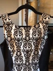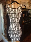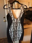 This stunning black and white paisley bodycon dress from Body Central is the perfect addition to any wardrobe. The sleeveless design, round neckline, and pullover closure make it easy to wear for any occasion, whether it's a party or a casual day out. The dress is made from a comfortable and stretchy knit fabric, consisting of polyester and spandex, that fits perfectly in all the right places. The dress features a lined and backless design, collared neckline, and a short length that makes it perfect for showing off your legs. The dress is available in size medium and can be easily hand washed for long-lasting wear. Whether you're looking for a sexy and comfortable dress or simply want to add to your collection, this Body Central dress is a great choice.