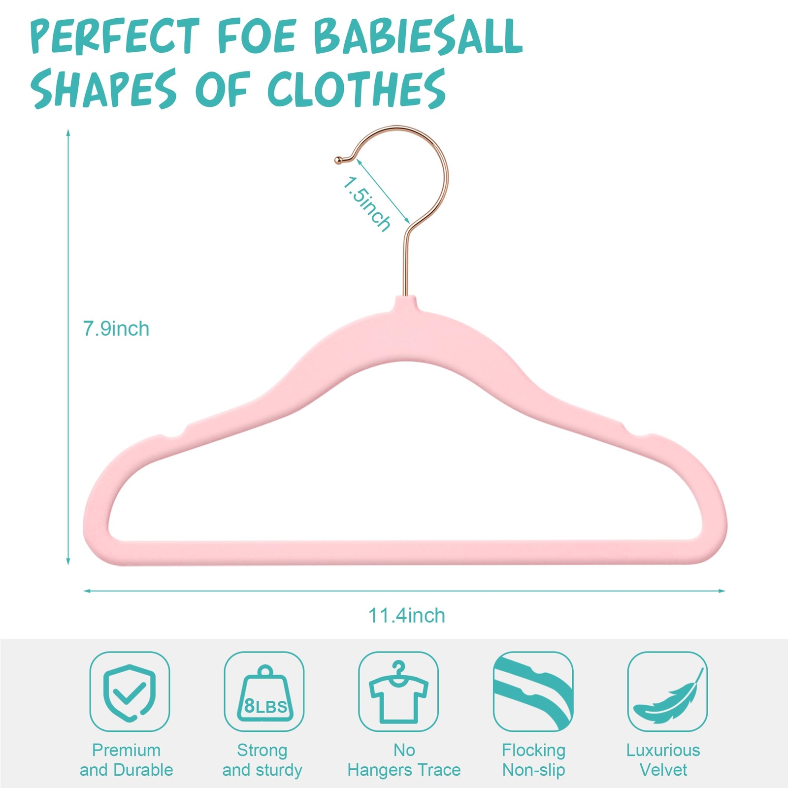 【SUPER VALUE SET】Pack of 50 lightweight velvet hangers adds a touch of luxury to your closet. the ultra-thin profile of hangers for your baby's closet and add up to 50 percent more space, perfect for ' jackets, pants, shirts, dresses, and more. 【PERFECT DIMENSIONS 】Velvet coat hangers lightweight yet sturdy, With ideal dimensions each: 11.8” x 2” x 7 ⅜”, The thickness of this baby hanger is only 0.5cm which takes up less space compared to other hangers. The ultra-thin design maximizes the storage space and fully utilizes your wardrobe. 【LUXURIOUS VELVET HANGERS 】: Velvet flocking Non-Slip baby clothes hangers feature a shiny rose gold hook with a 360-degree swivel, which will not rust. Not only are they attractive, but our clothes hangers can hold up to 5 pounds, making them ideal for hanging everything from onesies and overalls to winter coats and summer dresses. 【ERGONOMIC DESIGN 】The clothes hangers feature contoured shoulders that keep clothes in shape, while cut notches keep straps in place. A horizontal bar covered in the velvet grips pants and prevents unsightly creases. 【 NON-SLIP DESIGN】 Supreme soft luxurious velvet instead of plastic or metal leaves no crease on the pant when you fold them over. Prevents slippery or wide neck clothes from slipping off the flocked hangers, no shedding or fading on your white clothes with the latest flocking technique. Great coat hangers for &baby suits, shirts, coats, sweaters, skirts, dresses, and pants, etc.