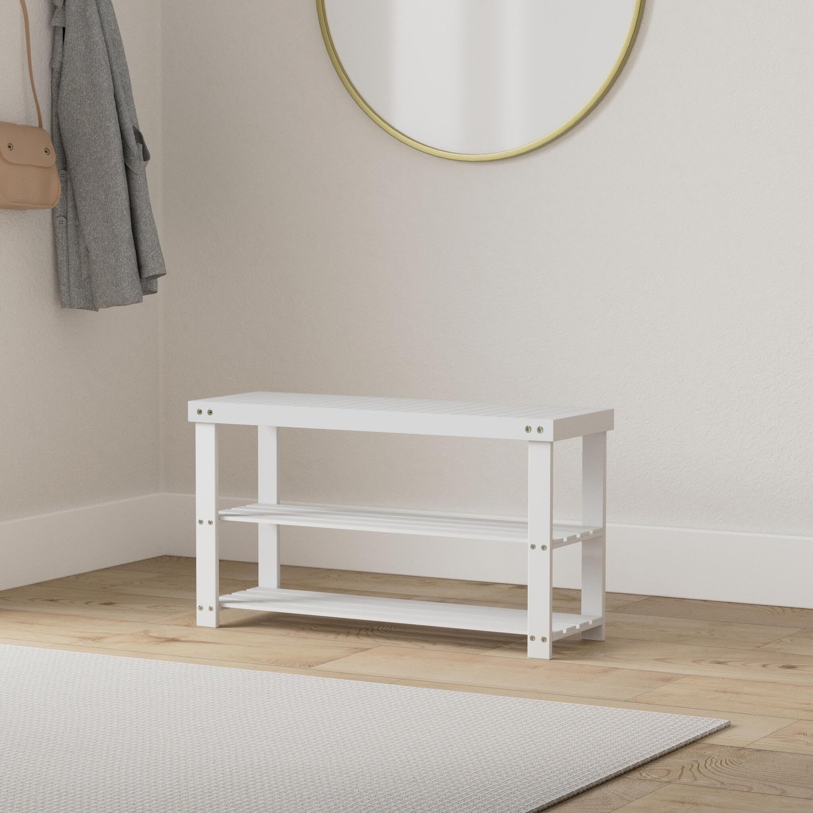 ★ Made of 100% well-sanded solid bamboo and covered with an eco-friendly protective coat of lacquer, touching very smooth and looking beautiful, fits great in your hallway, closet, living room, bedroom, bathroom, patio or kitchen ★ HIGHLY VERSATILE : This shoe shelf is a combination of bench and storage, great for organizing shoes, bags, box, also perfect use it as a plant stand, bathroom rack, sofa side shelf, end table, bed end and more ★ EASY TO INSTALL & STURDY: With included illustration and tools, only a few simple steps will set it up. Top and frame with strong bamboo plank and galvanized metal parts hold up to 255 lbs static load ★ SAFE DESIGN & PROPER SIZE: Counterbore, smooth surface, and round corners will cause no harm to your belongings. Ideal size of 33.86 x 11.23 x 17.9 inches accommodates up to 4 pairs of shoes per shelf ★ WHAT YOU GET: high quality shoe rack bench, friendly customer service