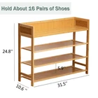 Number of Shelves:4MPN:shoe rackType:Shoe RackFeatures:StackableItem Depth:10.6 inItem Weight:more than 9 lbItem Width:31.5 inNumber of Items in Set:10/11Assembly Required:YesMaterial:BambooItem Height:24.8 inMounting:Free StandingModel:SRCapacity:16-20 pairsBrand:SOBIBO