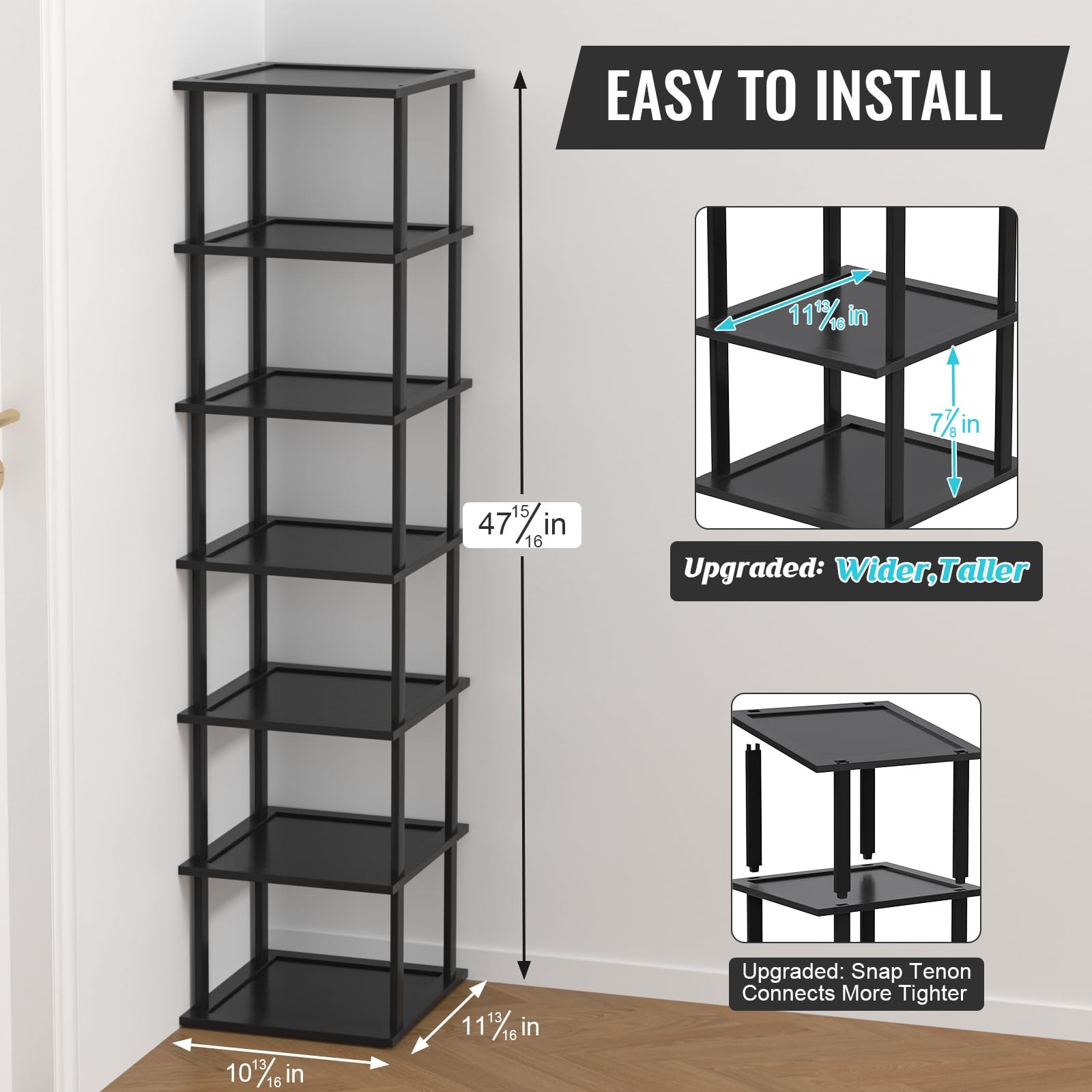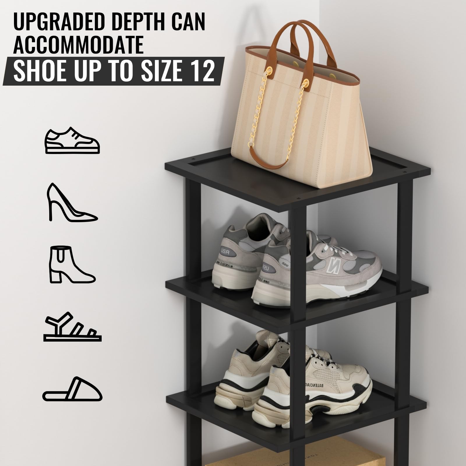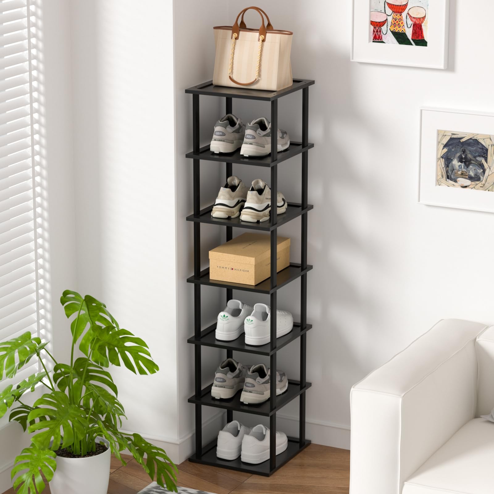 Bamboo Shoe Rack - an easy-to-assemble storage solution that requires no tools! Crafted from natural bamboo, this shoe rack is not only eco-friendly but also a stylish addition to your home. The innovative design features wave-shaped buckles for a secure and tight fit during assembly. Choose from three convenient sizes โ 7-tier, 12-tier, and 18-tier โ to accommodate various shoe collections. Additionally, the rack is available in both the natural color of bamboo and a sleek black option, allowing you to match it seamlessly with your decor. We've upgraded this bamboo shoe rack to provide ample space for longer shoes, making it perfect for accommodating larger sizes, including big men's shoes. Say goodbye to cluttered entryways and closets with this versatile and space-saving solution. Transform your shoe organization experience with our Bamboo Shoe Rack โ the perfect blend of functionality, style, and eco-conscious living! ๐๐ฉ๐ ๐ซ๐๐๐๐ ๐๐๐ฉ๐ญ๐ก ๐ญ๐จ ๐ ๐ข๐ญ ๐๐๐ซ๐ ๐๐ซ ๐๐ก๐จ๐ ๐๐ข๐ณ๐๐ฌ: The improved design of our bamboo shoe rack accommodates longer shoes, providing the perfect solution for larger sizes and ensuring all your shoe can fit, can hold everything from slippers and sandals to boots and sneakers, including men's large shoes ๐๐๐ฌ๐ฒ ๐๐ฌ๐ฌ๐๐ฆ๐๐ฅ๐ฒ, ๐๐จ ๐๐จ๐จ๐ฅ๐ฌ ๐๐๐ช๐ฎ๐ข๐ซ๐๐: Our tall shoe tower rackโs innovative design allows for assembly without the need for any tools. Just insert the wood rods to connect each shoe shelf. And Upgraded wave-shaped snap tenons make your shoe shelves more secure and safer ๐๐ฎ๐ฅ๐ญ๐ข-๐ ๐ฎ๐ง๐๐ญ๐ข๐จ๐ง๐๐ฅ: Beyond shoes, this wood shoes rack is a versatile storage solution, perfect for plants, pictures, little Knickknacks, candles, and more in your home or outdoor. Elevate your space with functional style, the small shoe rack has a sleek, modern look that complements any decor ๐๐ซ๐๐ฆ๐ข๐ฎ๐ฆ ๐๐ฎ๐๐ฅ๐ข๐ญ๐ฒ ๐๐ง๐ ๐๐ฉ๐๐๐-๐๐๐ฏ๐ข๐ง๐ : Crafted from high-quality bamboo, our narrow shoe rack is not only durable but also environmentally friendly. Built to withstand daily use. The space-saving design of the corner shoe rack makes it ideal for small space such as entryways, closets, garages, and more. Maximizes your space with its efficient and stylish design ๐๐๐ซ๐๐๐๐ญ ๐๐ข๐๐ญ: Delight your loved ones with this tall skinny shoe rack as a thoughtful and practical gift. The stackable shoe rack does more than just a sustainable shoe storage; it's a stylish addition to any home. You can also design layers according to your own space and stack them freely, making your home no longer messy