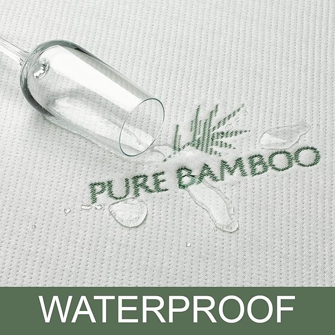 ✔ COMPLETE WATERPROOF MATTRESS PROTECTION: Accidents happen! Don't let a midnight mishap or sickness side-effect ruin your day;;; or your sleep schedule; Keep your mattress fully protected from moisture, damp conditions, wetness, spills, sweat, night time accidents and stains with this premium waterproof cover from Pure Bamboo; Carefully designed to meet the needs of toddlers, children, adults, the elderly, the incontinent with sizes available for the whole family! ✔ ENHANCE YOUR SLEEP for years to come with a waterproof mattress protector by Pure Bamboo; Safeguarding your mattress against stains, dust mites and perspiration will extend its usefulness and improve your comfort COMPLETE WATERPROOF MATTRESS PROTECTION: Accidents happen! Don't let a midnight mishap or sickness side-effect ruin your day;;; or your sleep schedule; Keep your mattress fully protected from moisture, damp conditions, wetness, spills, sweat, night time accidents and stains with this waterproof cover from Pure Bamboo; Carefully designed to meet the needs of toddlers, children, adults, the elderly, the incontinent with sizes available for the whole family! ✔ COMPLETE WATERPROOF MATTRESS PROTECTION: Accidents happen! Don't let a midnight mishap or sickness side-effect ruin your day;;; or your sleep schedule; Keep your mattress fully protected from moisture, damp conditions, wetness, spills, sweat, night time accidents and stains with this premium waterproof cover from Pure Bamboo; Carefully designed to meet the needs of toddlers, children, adults, the elderly, the incontinent with sizes available for the whole family! Product Description Waterproof Mattress Protector COMPLETE WATERPROOF MATTRESS PROTECTION Accidents happen! Don't let a midnight mishap or sickness side-effect ruin your day... or your sleep schedule. Keep your mattress fully protected from moisture, damp conditions, wetness, spills, sweat, night time accidents and stains with this premium waterproof mattress cover. Carefully designed to meet the needs of toddlers, children, adults, the elderly, the incontinent, pets and allergy sufferers. With sizes available for the whole family! THE SOUND OF SILENCE... and maybe snoring! But, one thing’s for sure – this exquisite cover is 100% crinkle-free, odor- free, noiseless and won’t disturb a wink of your sleep. WATERPROOF PROTECTION Protect your mattress investment with this Mattress Protector coated with a cool and comfortable TPU membrane barrier designed to prevent spills and stains from penetrating. 16 INCH DEEP POCKETS Deep 16 inch pockets and an elasticized skirt make for effortless ease of application. Enjoy a perfect snug fit that won't shift, slide, or most importantly, affect the feel of the bed you love. LUXURIOUSLY SOFT Not all mattress covers and sheet protectors are created equal. Imported. Machine washable. Available in sizes: Twin (39x76 inches), Full (54x75 inches), Queen (60x80 inches), King (76x80 inches) & California King (72x84 inches)