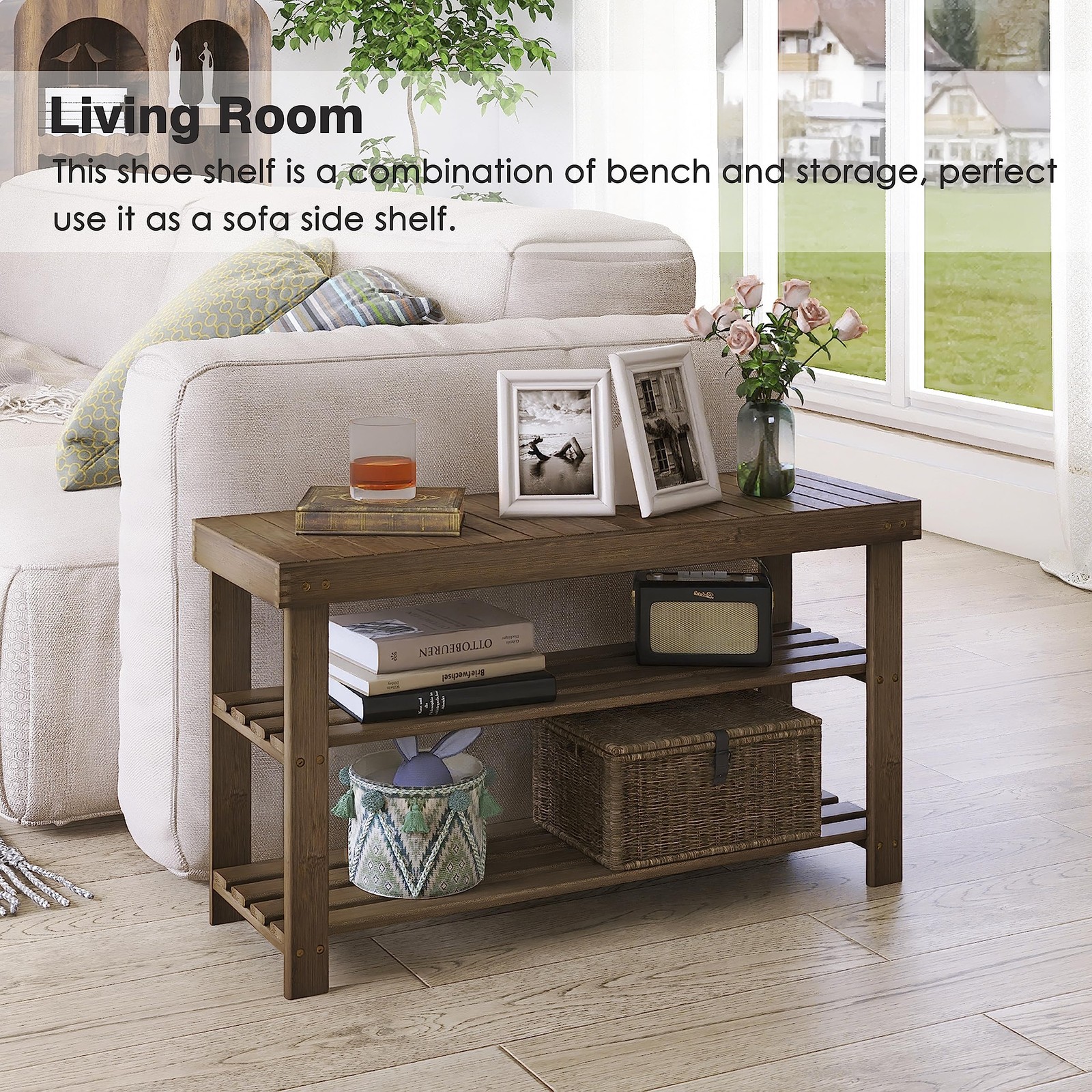 ★ Made of 100% well-sanded solid bamboo and covered with an eco-friendly protective coat of lacquer, touching very smooth and looking beautiful, fits great in your hallway, closet, living room, bedroom, bathroom, patio or kitchen ★ HIGHLY VERSATILE : This shoe shelf is a combination of bench and storage, great for organizing shoes, bags, box, also perfect use it as a plant stand, bathroom rack, sofa side shelf, end table, bed end and more ★ EASY TO INSTALL & STURDY: With included illustration and tools, only a few simple steps will set it up. Top and frame with strong bamboo plank and galvanized metal parts hold up to 255 lbs static load ★ SAFE DESIGN & PROPER SIZE: Counterbore, smooth surface, and round corners will cause no harm to your belongings. Ideal size of 33.86 x 11.23 x 17.9 inches accommodates up to 4 pairs of shoes per shelf ★ WHAT YOU GET: high quality shoe rack bench, friendly customer service