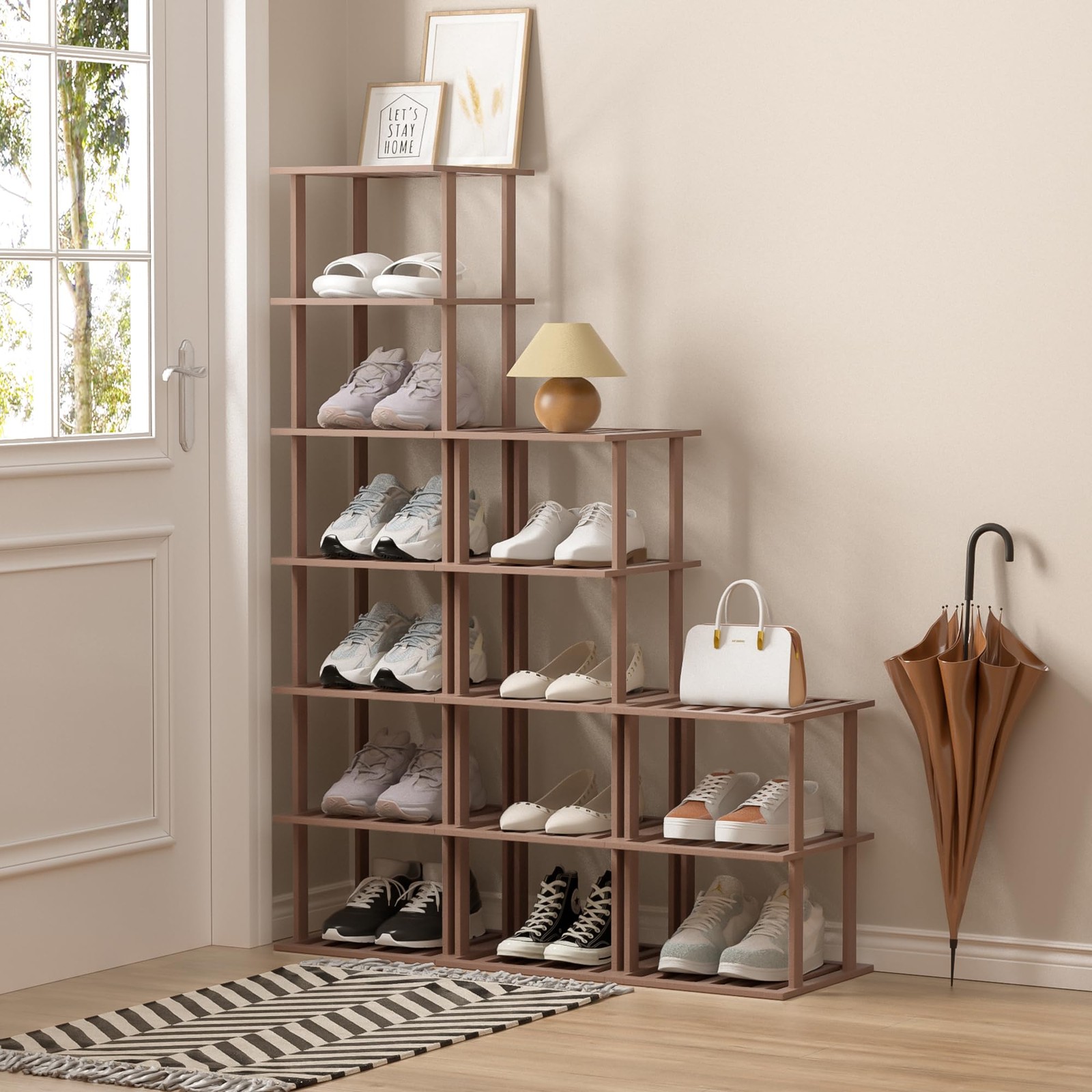 Bamboo Shoe Rack - Vertical Shoe Rack for Small Spaces, Stackable Shoe Shelf Space Saving Storage, Tall Vertical Narrow Shoe Rack Bamboo Shoe Rack - Vertical Shoe Rack for Small Spaces, Tall Narrow Shoe Rack Organizer, Stackable Shoe Shelf Free Stackable DIY - Space Saving Storage Vertical Shoe Rack - Tall Narrow Shoe Rack Organizer for Small Spaces,7 Tier Bamboo Shoe Shelf, Stackable Shoe Shelf Space Saving Shoe Storage,Free Stackable DIY… Bamboo Shoe Rack for Closet Free Standing Wood Shoe Shelf Storage Organizer Vertical Shoe Rack, 7 Tier Wooden Shoe Storage Organizer 【SPACE-SAVING SHOE RACKS】Perfect for small spaces, our narrow bamboo shoe rack features a 7-tier vertical design that stands tall and fits in a corner. You can also adjust the tiers to fit your space; if you have multiple shoe racks, you can stack the tiers to create more storage space for you. 【PREFERRED HIGH QUALITY BAMBOO】The closet vertical shoe rack is made of high quality bamboo and wood materials, with wider and thicker board surface, which deepens the storage space and provides stronger load bearing storage (each layer can bear about 20-26 pounds). Thoughtful details provide you with warm care, fine edge sealing, smooth and delicate touch, without curling or scratching your hands, enjoy a comfortable life. 【FASHIONABLE AND DURABLE】The tall narrow shoe rack has a fashionable and modern look, with a luxurious brown design that is elegant and understated, yet exudes a noble texture that complements any decor. 【EASY ASSEMBLY】The bamboo vertical shoe rack package has all the installation tools and accessories ready for you, just less than 10 minutes, you are done with the assembly. (Please note: find the 4 widest bracket interfaces and install them at the bottom, then stack them from bottom to top in order) 【MULTIFUNCTIONAL USE】Save floor space with this vertical shoe rack. Perfect for small spaces, it maximizes vertical storage in hallways, living rooms, bedrooms, garages and more without compromising your style. And the bamboo shoe rack can be used as a Christmas, Thanksgiving or birthday gift for your loved ones or friends.