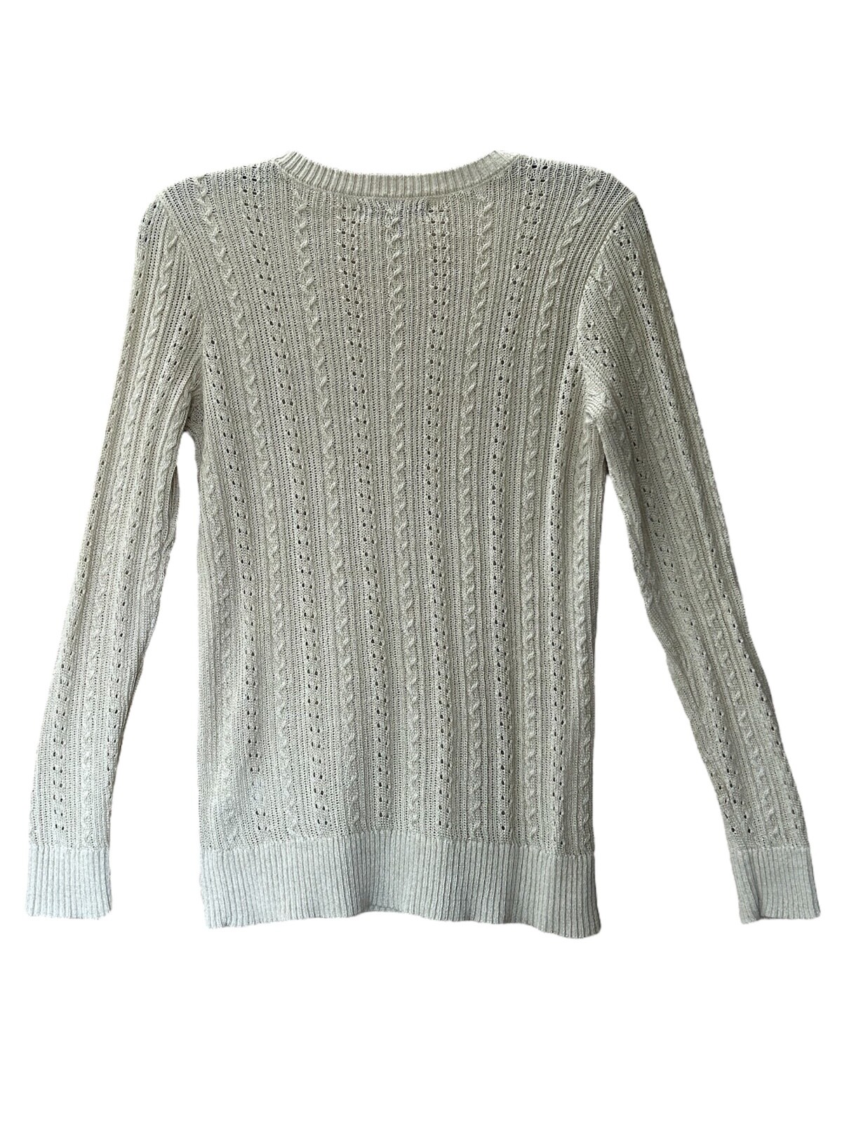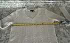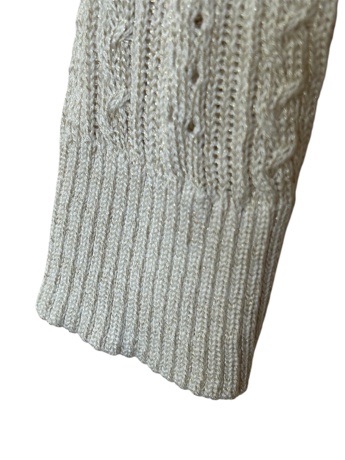 Banana Republic V-neck Cable Knit Ivory Cream Long Sleeve Pullover Sweater with metallic thread accents in Size Small. Beautiful sweater, you can wear casually or dress up formally with heels and slacks! It has a beautiful shimmer to it! Excellent pre-loved condition with no flaws or defects Measurements are approximately 16 inches across from side to side lying flat and unstretched and 25 inches in length. Fabric content is acrylic, viscose, polyester, and metallic. Machine washable. Please see all photos for close-up and measurement details. All my items come from a smoke-free home I am a seller with a five star rating and speedy same-day shipping Stylish casual formal sparkly boho night out ISO whimsical elegance warm shimmer cotton blend vtg retro cottage holiday party Christmas winter fantasy boho countryside chic work warm cozy shrug loose fit relax fit oversized fall winter