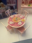 Barbie 1985 Dining Room Set- complete set includes: dining table with reversible top and lazy Susan (works well), buffet/server, 4 chairs, 4 reversible cushions, candelabrum, 2 candlesticks, 2 vases, 8 plates, serving platter, 4 goblets, 4 sets of silverware, 4 placemats and original instructions. Also comes with mini food pictured. Comes in original box which is in good condition. Please let me know if you have any questions!