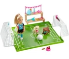 Barbie Dreamhouse Adventures Chelsea Doll Soccer Playset Blonde hair Blue eyes. Playset includes: Two goals, each with an adjustable scoring board, attach to a field area where Chelsea can practice and play -press down on her shoulders for "kicking" action! Two puppy friends with sporty bandanas can join in the fun, and a set of bleachers provides seating for fans and friends (not included). Includes storytelling accessories, like a gold medal, backpack, water bottle, snacks and a ball. Chelsea doll is game-ready in a colorful soccer jersey with sporty stripes, matching shorts, shin guards and shoes Shipping costs includes supplies plus postage