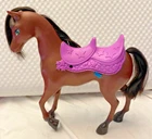 This Mattel 'A Pony's Tale' horse is a must-have for any Barbie collector. The purple Skipper Horse, made of vinyl, hard plastic, and rubber materials, comes with a saddle and fits 10"-4" dolls. This original licensed reproduction from 2012 is in great shape and ready for all occasions. The doll's brown eyes add a touch of realism to this imaginative toy. It weighs 10oz and is the perfect addition to any Barbie product line.