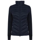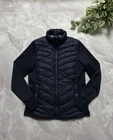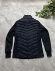 Barbour Langstone Sweat women's hybrid jacket in navy blue color with branded metal logo at the back Outer material and lining of the torso 100% nylon, Insulation 100% Fiberdown polyester Sleeves and side panels made of a combination material 65% polyester 35% cotton Double YKK zipper, 2 pockets with buttons on the front CONDITION Excellent, without defects SIZE UK 10 MEASUREMENTS: Shoulders - 37 cm Sleeve (from the shoulder) - 62 cm Width (underarms) - 48 cm stretches to 52 cm Width (at the waist) - 45 cm Length (from the neck) - 64 cm
