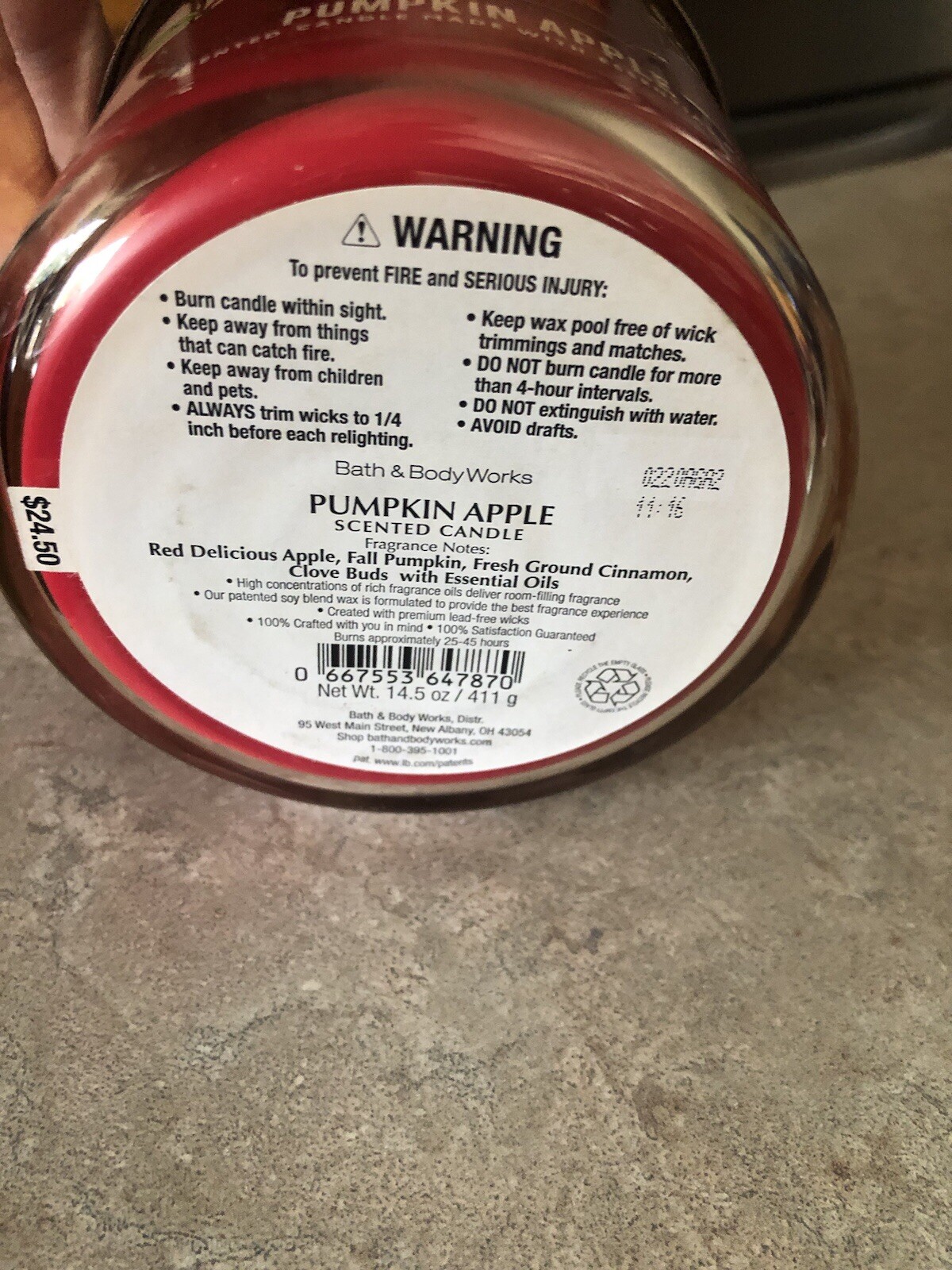 Bath & Body Works Pumpkin Apple 3 wick Candle 14.5 oz NEW. Please check out our other auctions. We combine shipping on multiple purchases IF ABLE TO. Please ask prior to bidding if an item(s) can be combined. As always, all my items come from my pet & smoke free home. I ship all items with care. Payment is due within 4 days of auction ending date . **Please note, I can no longer ship to APO/FPO/AA addresses** I only ship within the United States.