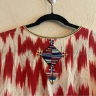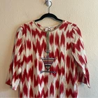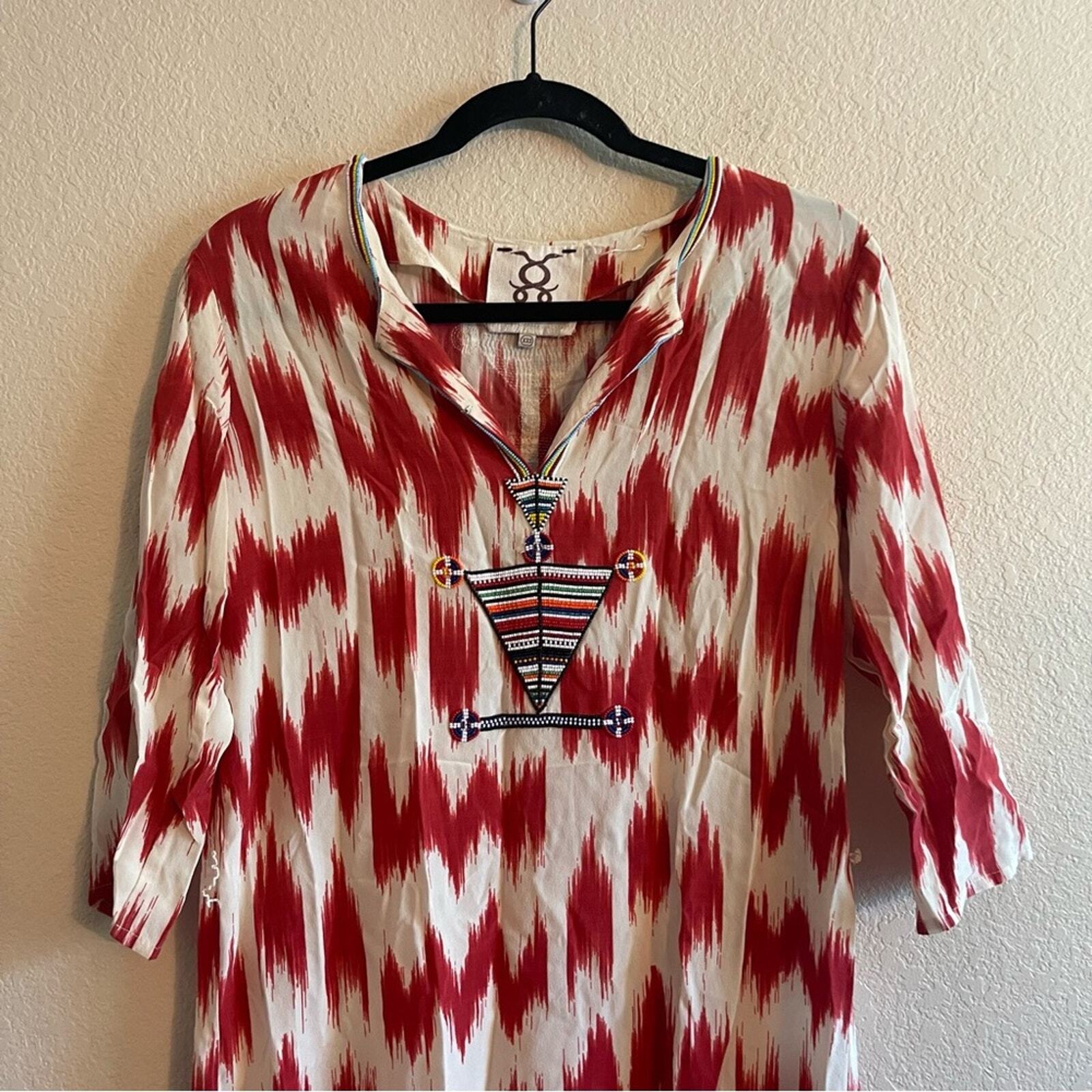 Figue Ikrat Julia Print Red White Beaded Silk Boho Dress Women’s Size XXS This item is in great preowned condition, cute, trendy. Don’t have belt. Loose, relaxed fit. All silk, lightweight, beaded. A few beads missing on the front (pictured) Women’s Size XXS Approx Measurements: Pit to Pit: 18 in Length: 36 in Sleeve Length: 21 in