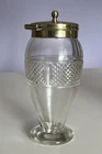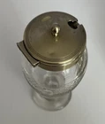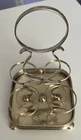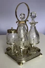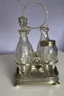 Beautiful J&RG EPNS Silver Plated Crystal Cruet Condiment Set of 4 Pieces - J&RG is J & R Griffin or Joseph James Griffin and Richard Charles Griffin, active1895 - 1926 Birmingham. This makes this unique set a true antique from a local Texas estate. Pretty elegant crystal and streamlined holder, not fussy. Crystal in good condition. One stopper does not fit or appear original to set. One bottle has cork but appears to be missing dispensing top. One stopper fits very well and fourth piece has a nice flip lid which appears to work well. Please review all pictures carefully as they are part of the description. Questions are welcome.