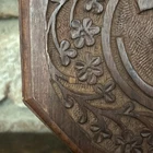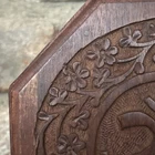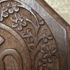 This Beautiful Carved Wooden Box with Om Symbol and Lotus Design is a unique and handmade storage box suitable for any room. The medium-sized box features intricate carvings on its octagonal shape, making it a striking piece for adults. Made of wood with a matte finish, this brown box is perfect for storing mini candles or keepsakes. With origins in India, this original piece adds a touch of elegance to any space with its exquisite design. Clean with a damp cloth to maintain its beauty. Measures 6.75 inches width, 3 inches tall.