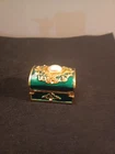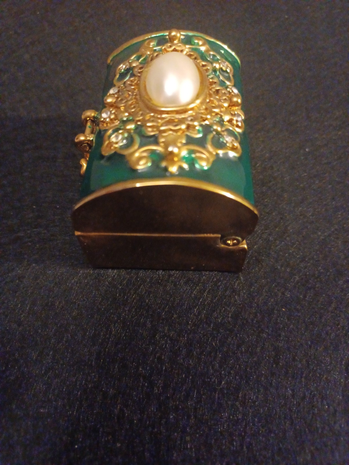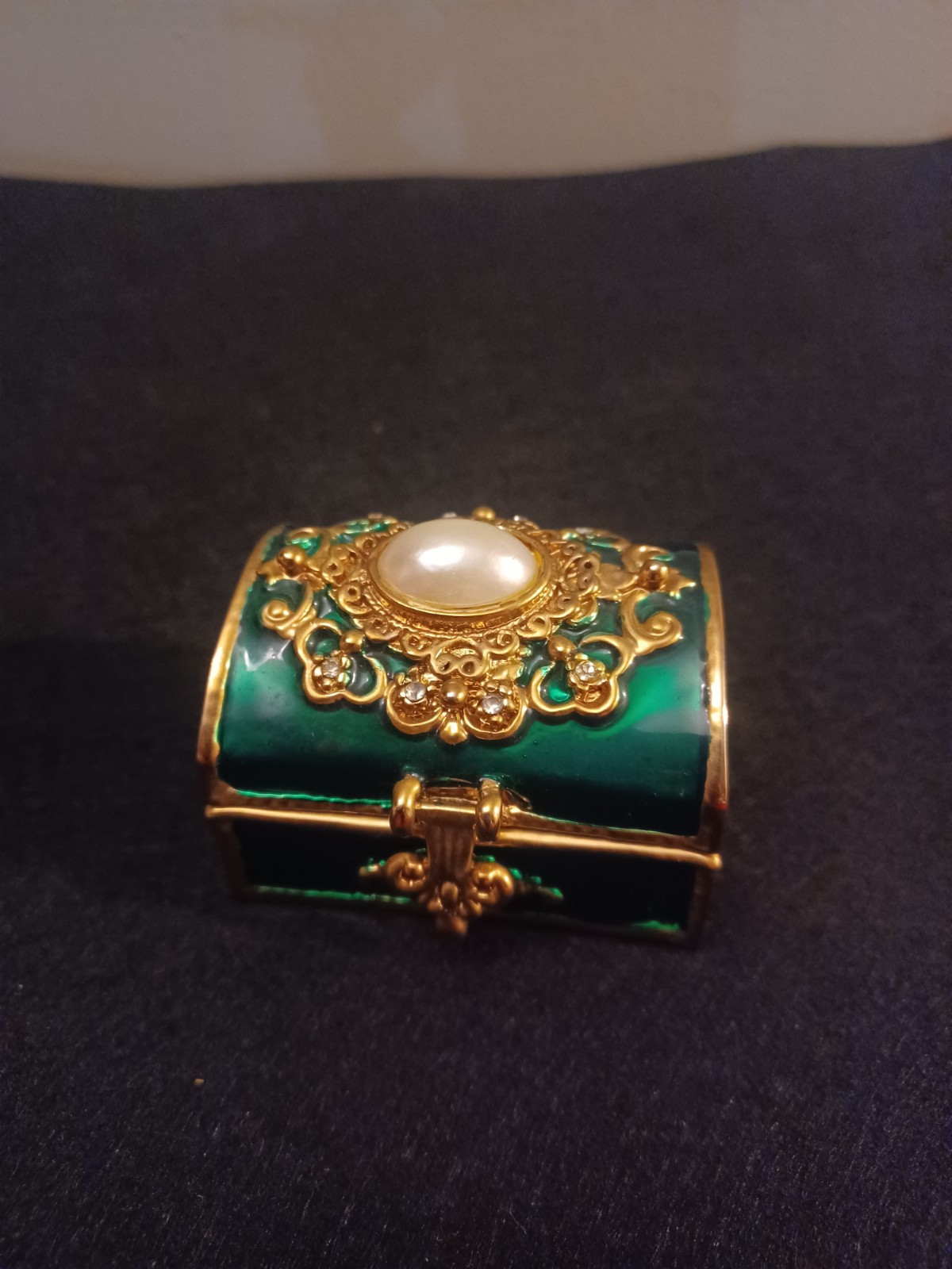 The product is a beautiful green trinket box made of gold-tone metal with a faux pearl embellishment. It is designed to store small items or jewelry and adds a decorative touch to any room.