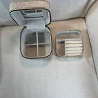The Bebe Compact Travel Jewelry Box is a stylish and practical travel accessory, perfect for storing and showcasing your jewelry while on the go. Made from faux leather with a silver gold color, this square-shaped box features a removable tray for easy organization and a mirror for added convenience. The velvet lining ensures your precious items are protected, making it suitable for necklaces, bracelets, anklets, rings, cufflinks, earrings, and body jewelry. With a zip-around closure and compact size of 5.25” in length and width, this travel jewelry case by Bebe is a must-have for any jewelry lover. Excellent condition. Height 3.75” Weight 12.5 oz