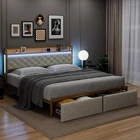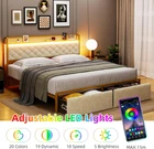 Full / Queen Size Bed Frame LED Upholstered Headboard 2 Drawers Platform Full / Queen Bed Frame with LED Lights: Bed frame LED Lights with remote control, support mobile APP via Bluetooth. 16 million colors RGB lights headboard have Music Mode, Brightness Adjustment, Timing and 20 Scene Modes. You can effortlessly create captivating light atmospheres for your bedroom, which can also be used as a night or reading light. Bed Frame with Drawers: Bed frame with 2 big front drawers can hold some clothes or daily necessities. Upholstered platform bed with storage headboard not only provides a comfortable place to lean on but also doubles as a storage shelf, providing ample space to store books, decorations, a clock, or personal items within easy reach. Queen Size Bed Frame with Charging Station: Tall headboard with charging station including 2 USB ports and 2 AC outlets, so you can conveniently charge your phones without leaving the comfort bed. Upholstered Platform Bed: Sturdy bed frame headboard was filled with a full sponge to provide resilient support. Soft linen fabric has a great touch, bringing a comfortable sleeping experience. Heavy-duty bed frame design provides sufficient stability for bed frame with outlet, no box spring needed and has a long life. Easy to Assemble: LED bed frame has been optimized for installation steps to make installation more convenient. Comes with instructions and necessary installation tools, friendly for people with no assembly experience. Specifications: Color:Gold Material:Metal,MDF Board,Linen Size:Full / Queen Size Max. Weight Capacity:1100 lb Item Weight:104 lb Please Note:Mattress not included! Special Feature:RGB LED Lights, Remote Control, 2 Storage Drawers, Squeak Resistant, USB Port Package Included: Bed Brame * 1 Installation Tool * 1 User Manual * 1