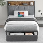 FREE SHIPPING 30 DAYS RETURN EASY PAYMENT Bed Frame with Headboard and Storage, Drawers Platform Bed Frame with Storage About this item HEADBOARD WITH STORAGE SHELF & CHARGING STATION - The bed headboard is built-in with 2 outlets, USB, and 1 Type-C charging port. Convenient for you to place iPhone/Android and other devices on it. The queen bed frame with a storage shelf helps you easy to find your phone, turn off the alarm clock, and get stuff you need while enjoyably lying on the bed. BED WITH 2 FABRIC STORAGE DRAWERS - This queen size bed frame with drawers provides 9.8" space underneath to store shoes, boxes, and luggage. It also comes with 2 dustproof fabric drawers with wheels to put your clothes or bedding and is easy to pull out. Maximized the bed space utilization, keep your room looking tide and clean OPTIONAL SELF-ADHENSIVE LED LIGHTS- Each bed frame comes with 1 extra self-adhesive led light, recommended assemble it on the bed frame headboard shelf or headboard backside. The remote / APP controllable RGB led lights, which are over 20 colors choosable and 4 adjustable modes, create your favorite bedroom atmosphere SUPER STURDY & NOISE FREE - 11 thickened metal slats system of the platform bed frame offers extra stability and holds up to 1000 lbs. No worry about kids jumping on it. All the screw holes are accurately prepared, and each piece connects well to avoid squeaking. Fit all deepth of X mattresses, No Box Spring Needed, giving you a quiet and restful sleep EASY TO ASSEMBLE -No additional tools required. It takes about 45 minutes for two people to assemble. REVIEWS The product came very well packaged. I'm very happy. thank you for everything. Seller strongly recommended. This is great! I definitely recommend! Product looks amazing Delivery was fast. Excellent seller, great communication. I advise everyone to buy it!
