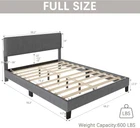 Product Description Sparkle Point Height Adjustable Headboard Easily Fast Assemble 1 Grey 2 Light Grey 3 Beige Upholstered Headboard The upholstered headboard is filled with high-density thicker sponge, you will enjoy more comfortable relax time when leaning against it. High-quality Fabric The surface of the whole bed frame is crafted with the unique fabric,it is soft, skin friendly and breathble, offer you really comfortable experience. Solid Wood Slats Ten solid wood support slats which are made of hardwood allow a strong load-bearing capacity, suitable for a long time use of a family. Strong Support Feet Strong hardwood was used to produce the heavy-duty support feet, when you lying or sitting in bed, you will be surprised at how solid it is. Specifications Color Grey/Light Grey/Beige Size Full/Queen Material Fabric&Metal&Wood Box Spring Required No Assembly Required Yes Wood Slats Support Yes Mattress Height 8''-12'' Weight Capacity 800lbs Box Spring Includes No Package Includes Bed Frame/Headboard