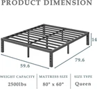 About this item STABLE STRUCTURE: Our queen size bed frame is made of durable reinforced steel; seamless welding; sturdy and durable; no shake; no squeak; provides a quiet and comfortable sleep all night long HEAVY DUTY QUEEN BED FRAME: Reinforced steel support slats, 2500 LB of weight capacity to give the mattress stable support, help extend the life of the mattress, queen bed frame no box spring needed EASY TO ASSEMBLE: Integrated structure design, quick & easy install, package includes all parts of the queen platform bed frame, instructions and tools (No additional tools required) UNDER-BED STORAGE SPACE: 12" clearance, bringing more storage space, keeping the room neat & organized. Minimalist design, black metal bed frame queen, easy to match various styles of rooms NO BOX SPRING NEEDED: Say goodbye to the hassle of an extra box spring. FSCHOS bed frame is specially designed to provide ample support for your mattress without the need for a box spring