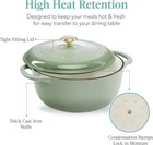 Package: 1X Best Choice Products 7.5 Quart Enamel Cast-Iron Round Dutch Oven, Family Style Heavy-Duty Pre-Seasoned Cookware for Home, Kitchen, Dining Room, Oven Safe w/Lid, Dual Handles - Sage Green Description: HEAVY-DUTY DESIGN: Thick cast iron is set with a glossy exterior finish and an enamel interior to combine lasting quality with easy upkeep. OVEN & STOVETOP READY: Sturdy and versatile, this dutch oven is well-suited to any cooking system! Use the side handles to take your meal from gas and electric ranges to your oven and grill; perfect for roasting, frying, or baking your favorite dishes FAMILY-SIZED: Feed large groups at potlucks, parties, and other gatherings as this family-sized dutch oven holds up to 7.5 quarts of casserole, soup, stew, roasts, and your other signature meals! HIGH HEAT RETENTION: Built to reach and maintain temperatures up to 480 degrees Fahrenheit, a set of condensation bumps on the heavy lid helps seal in moisture, heat, and flavor ELEVATE YOUR KITCHEN: A clean, glossy finish makes this dutch oven both a nostalgic icon and a modern addition to any well-equipped kitchen; features a brushed metal handle (silver or gold) for an extra touch of style!; OVERALL DIMENSIONS: 15"(L) x 12"(W) x 8"(H); OVEN CAPACITY: 7.5 Qt.