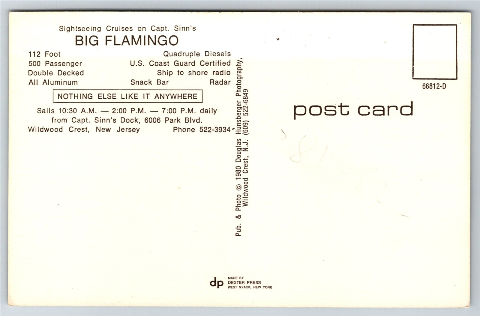 Big Flamingo Sightseeing Cruise Wildwood Crest NJ Postcard R14 Thank you for visiting! This is a standard size postcard, 3.5" X 5.5". Packaged in a sleeve for protection. In stock, usually ships within 24 hours of your purchase. Please ask questions if you are unsure about anything. My goal is for your complete satisfaction with the postcard and your experience. I have over 10,000 selections in my store. Check it out here RETIREDWITHBOOKS Powered by SixBit's eCommerce Solution