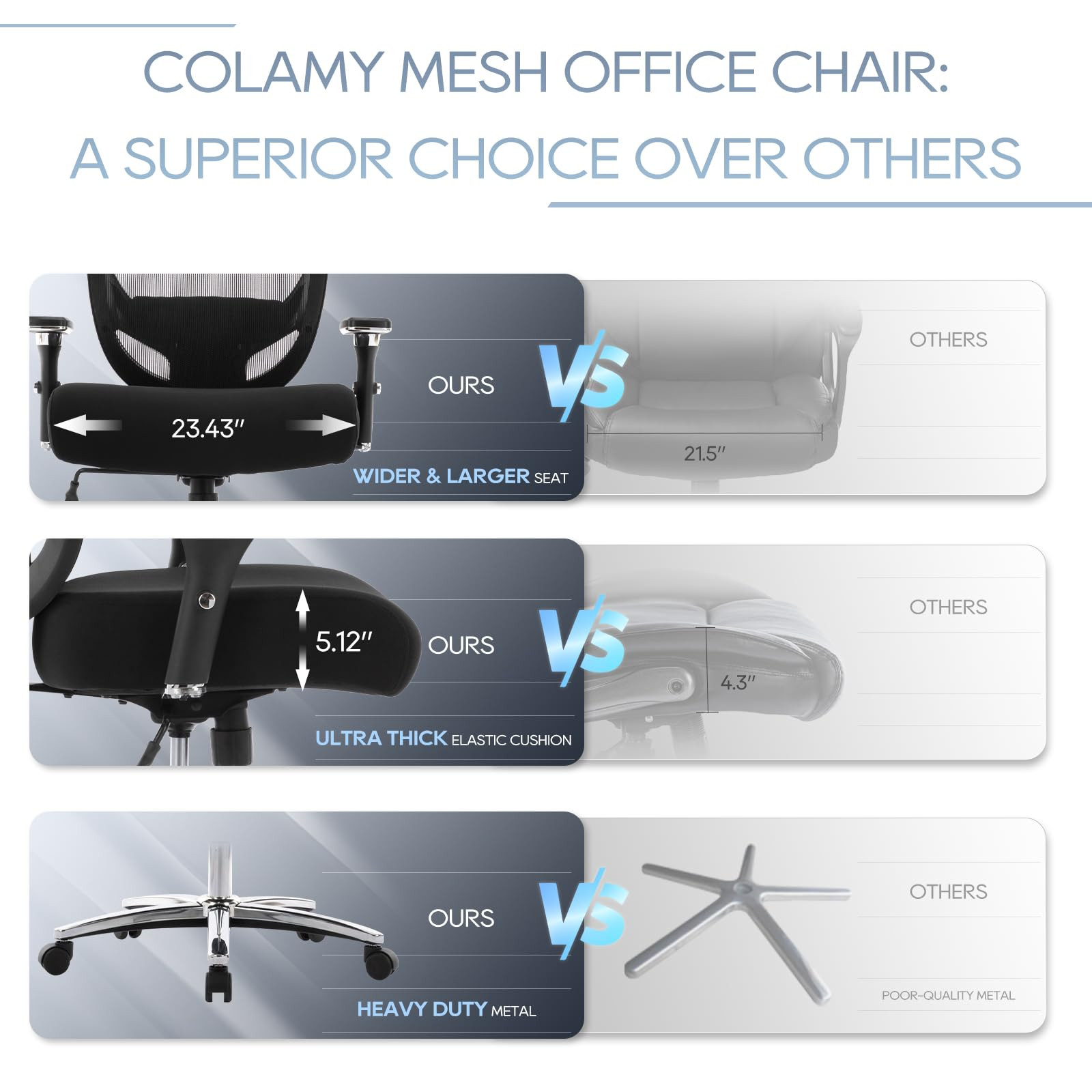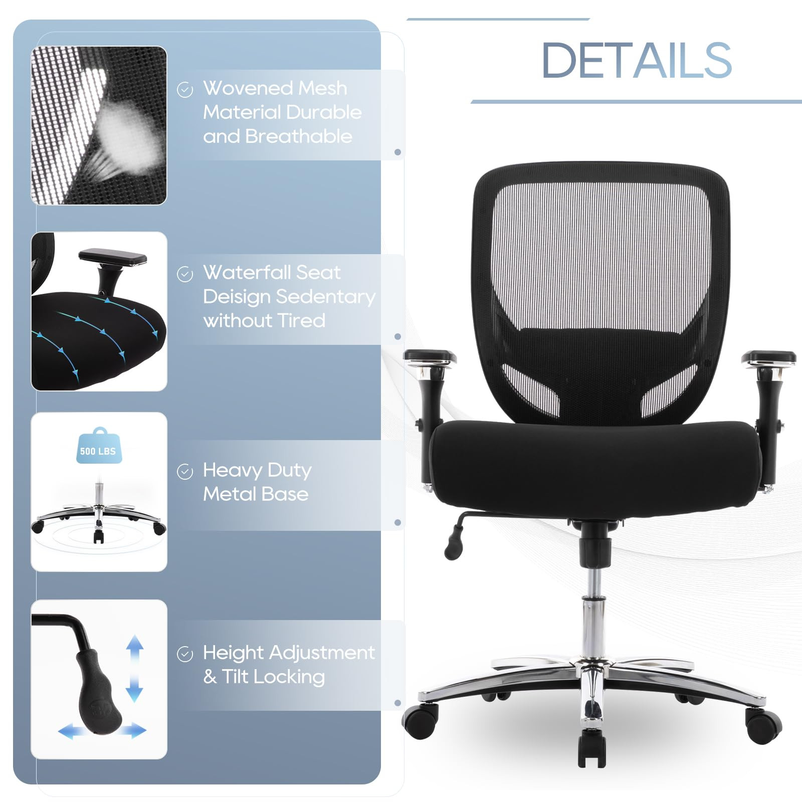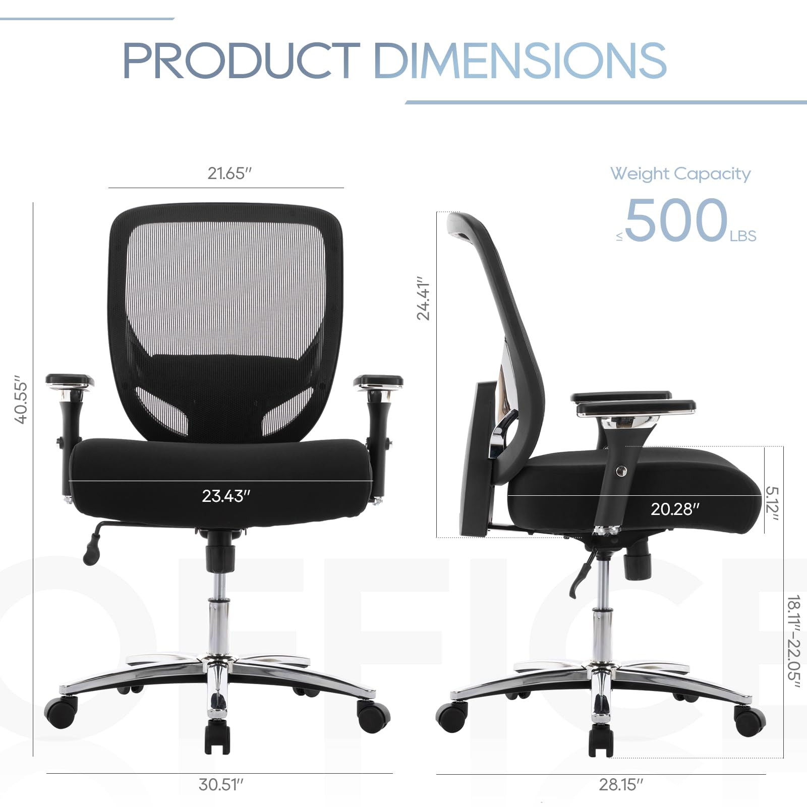 EXTRA LARGE & THICK SEAT: Enjoy unparalleled comfort, the big and tall office chair comes with a generously sized 23.43" wide and 5.12" thick seat cushion. Designed to provide superior support, this big and tall executive chair ensures that you stay comfortable and relaxed even during extended periods of sitting. FIRST-CLASS SEATING EXPERIENCE--What's inside the seat? High-density molded foam guarantees never-fail comfort and support. What's more, built-in spring pockets create the same elasticity and comfort as a sofa or mattress. Waterfall front seat edges remove pressure in the low leg and improve circulation ADJUSTABLE BIG & TALL COMPUTER CHAIR: Equipped with 360° smooth-rolling wheels, a height-adjustable mechanism, and a versatile back rock system, this office chair for heavy people is designed to adapt to your every need. The adjustable rocking tension allows you to customize your rocking experience. HEAVY DUTY OFFICE CHAIR: The wide seat office chair has sturdy metal base and smooth-rolling casters, which can support up to 500 lbs, offering unmatched stability and reliability. Whether you’re moving around your workspace or engaged in high-pressure tasks, this extra large office chair remains solid and dependable. LARGE OFFICE CHAIR: With black mesh material, the oversized office chair not only adds a touch of elegance to your office but is also highly durable and easy to clean. Experience the comfort of the heavy duty chair. SINCERE SERVICE: Any questions about this wide executive office chair, don't hesitate to contact us, our customer service team is always here to respond to your email within 24 hours. We provide 12-month replacement parts service.
