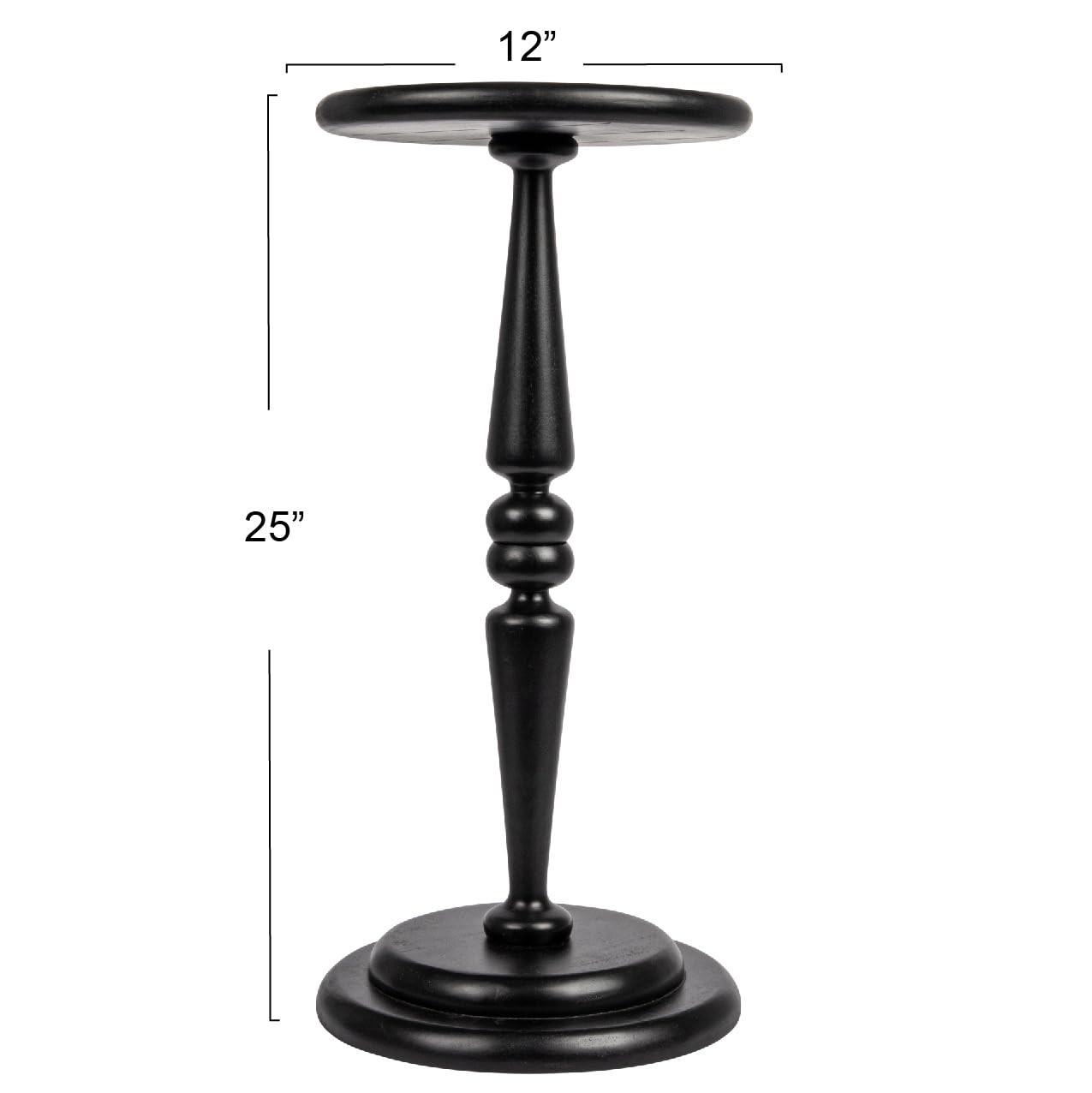 This round solid wood pedestal coffee table features a thick rounded edge top and a heavy solid wood base; It is ideal for use next to an accent chair in a living room, bedroom, or anywhere you may need to rest a martini Lathe turned solid hardwood Assembles in minutes with no tools required; Felt pads are included on base Base is double the thickness of the top to add weight and promote stability End table measures 12 inches diameter x 25 inches H