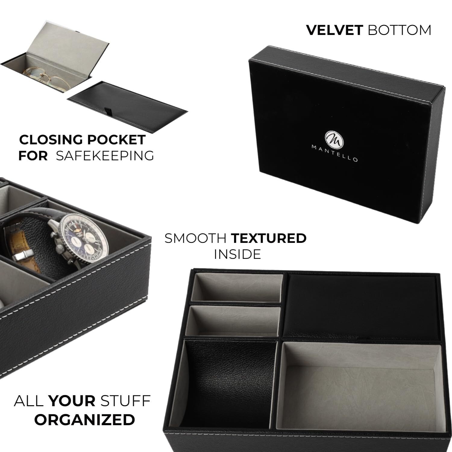 Mantello Nightstand Organizer, Small Valet Tray for Men, Black Valet Tray for Men: Crafted from carbon black faux leather with diamond texture, this men's valet tray offers an elegant and organized solution for your essentials. Nightstand Organizer: Ideal for nightstands, this versatile tray keeps your keys, wallet, phone, watch, and more within easy reach, reducing clutter in your room. Key and Wallet Holder: With 5 thoughtfully designed compartments, including one with a cover, this men's valet tray serves as a perfect key and wallet holder, keeping your items safe and organized. Mens Nightstand Tray: The sleek and modern design makes it a stylish addition to any nightstand, dresser, or office desk, perfect for holding jewelry, glasses, coins, and more. Desk Organizer and Jewelry Organizer: This valet tray doubles as a desk organizer or jewelry organizer, ensuring a tidy and functional space for your everyday essentials. Brand:Mantello Color:Black Features: â KEEP 'EM ORGANIZED - This edc dump tray helps you keep your most-used items in one place. Place your phone, glasses, money, jewelry, and wallets in our space-saving faux leather and suede box. â CLASSY STORAGE SPACE - Our edc tray's dark and sleek exterior looks suave on any bedside table, nightstand, or drawer. It's a modern and sophisticated catchall for your office or bedroom. â ALWAYS AT YOUR REACH - Save time and energy as you prepare for the day. This 10.25Lx7.38Wx2.13H" caddy lets you store your daily necessities and essentials where you can easily see them. â EXQUISITE CRAFTSMANSHIP - The nightstand tray's interior is lined with grey suede. The bottom is felt-lined and strong against scratches. Every stitch is impeccably made against the black PU leather. â A STYLISH & FUNCTIONAL GIFT - This dresser top organizer won't ever fall out of . It's a useful gift for all the men in your life. The tray comes in a presentable and ready-to-wrap packaging. Details:Constantly forget where you place your valuables after a long day? With everything on your plate, itâs no wonder you misplace your items from time to time. But arenât you tired of frantically looking for your keys, wallet, and phone? Imagine all the time youâve wasted in the bedroom rooting through your drawers, searching for your watch or wallet. You also risk damaging your jewelry, glasses, and phone by just placing them atop tables or drawers. Start your day right by keeping all your everyday essentials in one place with Mantelloâs Valet Tray Nightstand Organizer! Our nightstand organizer keeps your items in one place for a peaceful, organized, and panic-free morning. Cut down the time it takes to get ready for work by placing your wallets, keys, jewelry, and mobile phone in our black PU leather tray. This organizer has five compartmentsâtwo for your mobile phones, one for watches or jewelry, one rectangular portion for glasses and wallets, and a square one for money or keys. The inner suede lining isn't only gorgeous, but helps protect your valuables from nicks and scuffs. Each valet tray comes in handsome black PU leather. It makes an impressive yet subtle statement in your living room, bedroom, or office. Here are more reasons to love our bedside tray organizer: â Multifunctional storage for small items â Built with a sturdy base for long-term use â Cash compartment is sloped, which lets you easily scoop up bills and coins â Phone compartments hold your gadgets upright, so you can still see the screen â One of the compartments has a lid to keep your items safe from dust Store your valuables in an elegant organizer. Add Mantello Valet Tray Nightstand Organizer to your cart TODAY! UPC:0757104354873 EAN:757104354873 Binding:Kitchen Item Condition:New SHIPPING - We offer FREE shipping on all orders! - We ship within 3 business days of payment, usually sooner - We only ship to the lower 48 states, no APO/FPO addresses or PO Boxes allowed International buyers – please note: Import duties, taxes, and charges aren't included in the item price or postage cost. These charges are the buyer's responsibility. - Please check with your country's customs office to determine what these additional costs will be prior to bidding or buying. - We have confidence in our products, but if you are not fully satisfied please contact us within 30 days of purchase and you will get full refund. * Order Cancellation Policy ** You can return a product for up to 30 days from the date you purchased it. 1. The seller reserves the right to cancel the special case only due to eBay cancellation fee. 2. The decision of seller is the final. 3. The seller will respond to the cancellation request within 2 business days. Please wait for the result of cancellation. 4. In case the cancellation is not completed by some reasons, the buyer can follow the options below to get the refund. 4.1 The buyer can reject the item when it arrives. 4.2 The buyer can send the item back to the seller within 30 days If the buyer receives item (USA Shipment ONLY). The seller will provide the FREE return label to the buyer when the buyer opens " Return Item" case on eBay by using the reason as "Change my mind" ONLY. 5. When buyer has placed the order. The order will be processed and completed by automatic warehouse system within 5 minutes. In case that buyer sends the cancellation request after 5 minutes of placing the order, the request will be rejected. **Sending direct message to cancel the order is not allowed for every case.* Return Policy For the return case - If buyer would like to return the items for refund or replacement, please CONTACT SELLER to receive the free return label from seller. The refund or replacement will be processed with the tracking number of return label which is provided by seller only. The other ways of return which are not approved by seller will not be processed for the refund or replacement.