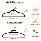 UEAKPIC Black Velvet Hangers 50 Pack, S-Shaped and Stackable Non Slip Felt Hanger with 360°Swivel Hook, Ultra Thin and Space Saving Flocked Hangers for Suits, Shirts, Coats, 15Lbs Capacity Heavy Duty ULTIMATE CONVENIENCE : Our 50 pack package includes two types of clothes hangers: S-shaped hangers and Stacked hangers. The S-shaped hanger can perfectly hang small neckline T-shirts without pulling or distorting. The Stacked hangers are 70% closet space-saving when you hang them together. Our two types of hangers, got you covered for all your needs! You can enjoy perfectly hung clothes and an organized wardrobe. It's time to upgrade your closet game MAXISIZE CLOSETSPACE : Our thin felt hanger's thickness is only 0.17 inches, even thinner than other 0.25 inches thick velvet hangers. And that's not all - when you stack multiple slim hangers together, you can maximize your wardrobe space by up to 70%. Imagine all the extra room you'll have for your clothes and accessories HANDLE UP TO 15POUNDS : Our velvet adult hangers have zinc-coated metal hooks that can rotate 360 degrees, rustproof and durable, and can handle up to 15 pounds. So, whether you're hanging bulky winter coats or suits for men, it's super easy and convenient.No more worries about coat hangers buckling under the weight ANTI-SLIP : The soft luxurious velvet surface prevents wide neck clothes from slipping off .With a excellent size of 17.5 * 9.2 and an ergonomic shoulder design, our clothing hangers are perfect for suits, shirts, coats, sweaters, skirts, dresses, and pants. Say goodbye to unsightly wrinkles and hello to a perfect hanging clothing MATCHCLOTHING FOR A WEEK : Our hanger is more than just a shirt hanger, it comes with an additional necktie bar to store ties, scarves, shawls, belts, and more. The groove design also allows you to hang vests, dresses, and bras. By using two types of hangers in advance to match your clothes, you can save time on daily clothing matching and keep your closet organized Introducing our Black Velvet Clothes Hanger 50 Pack - The ultimate wardrobe upgrade that combines innovation with convenience!Compared to other hangers 50 pack, every detail of ours is for greater convenience· Elegant and powerfulConstructed with quality materials and strong construction, each coat hanger can hold up to 15 lb, even for heavier coats· No Unsightly MarksUEAKPIC felt covered hangers for clothes bend in a 21 degree curve to mimic your shoulders, keeping your clothes in perfect condition and avoiding collisionsUpgrade your wardrobe, maximize your space, and say goodbye to wardrobe mishaps with our black velvet non slip space saving hangers with swivel. Get yours today and experience the joy of a well-organized closet!Specifications:Color: BlackMaterial: ABS Plastic, Velvet, Metal HookProduct size of S-shaped: 17.1"W x 9"H Product size of Stackable: 17.5"W x 9.25"HWeight of each S-shaped hanger: 2.57oz (73 g)Weight of each Stackable hanger: 2.68oz (76 g)Maximum Static Load of Each Hanger: 15 lb (6.8 kg)Package Contents:50 x Velvet HangerNotes:Please do not touch wet clothes.Please do not use the product in a washing machine or dryer.Please do not overload the product. SHIPPING Domestic Buyers - We ship within 3 business days of payment, usually sooner - We offer FREE shipping on all orders! - We only ship to the lower 48 states, no APO/FPO addresses or PO Boxes allowed - We have confidence in our products, but if you are not fully satisfied please contact us within 30 days of purchase and you will get full refund. International buyers – please note: Import duties, taxes, and charges aren't included in the item price or postage cost. These charges are the buyer's responsibility. - Please check with your country's customs office to determine what these additional costs will be prior to bidding or buying. Return Policy - This product comes with 30-Days Money Back Guarantee. - If you receive an item and it doesn't work properly or you don't like it because of any reason at all, - we have a 100% refund/return policy. We will ship you a new item or refund your money for the full sale amount. - For all returned products, buyers MUST contact us for the returning address. * Order Cancellation Policy ** You can return a product for up to 30 days from the date you purchased it. 1. The seller reserves the right to cancel the special case only due to eBay cancellation fee. 2. The decision of seller is the final. 3. The seller will respond to the cancellation request within 2 business days. Please wait for the result of cancellation. 4. In case the cancellation is not completed by some reasons, the buyer can follow the options below to get the refund. 4.1 The buyer can reject the item when it arrives. 4.2 The buyer can send the item back to the seller within 30 days If the buyer receives item (USA Shipment ONLY). The seller will provide the FREE return label to the buyer when the buyer opens " Return Item" case on eBay by using the reason as "Change my mind" ONLY. 5. When buyer has placed the order. The order will be processed and completed by automatic warehouse system within 5 minutes. In case that buyer sends the cancellation request after 5 minutes of placing the order, the request will be rejected. **Sending direct message to cancel the order is not allowed for every case.* Return Policy For the return case - If buyer would like to return the items for refund or replacement, please CONTACT SELLER to receive the free return label from seller. The refund or replacement will be processed with the tracking number of return label which is provided by seller only. The other ways of return which are not approved by seller will not be processed for the refund or replacement.