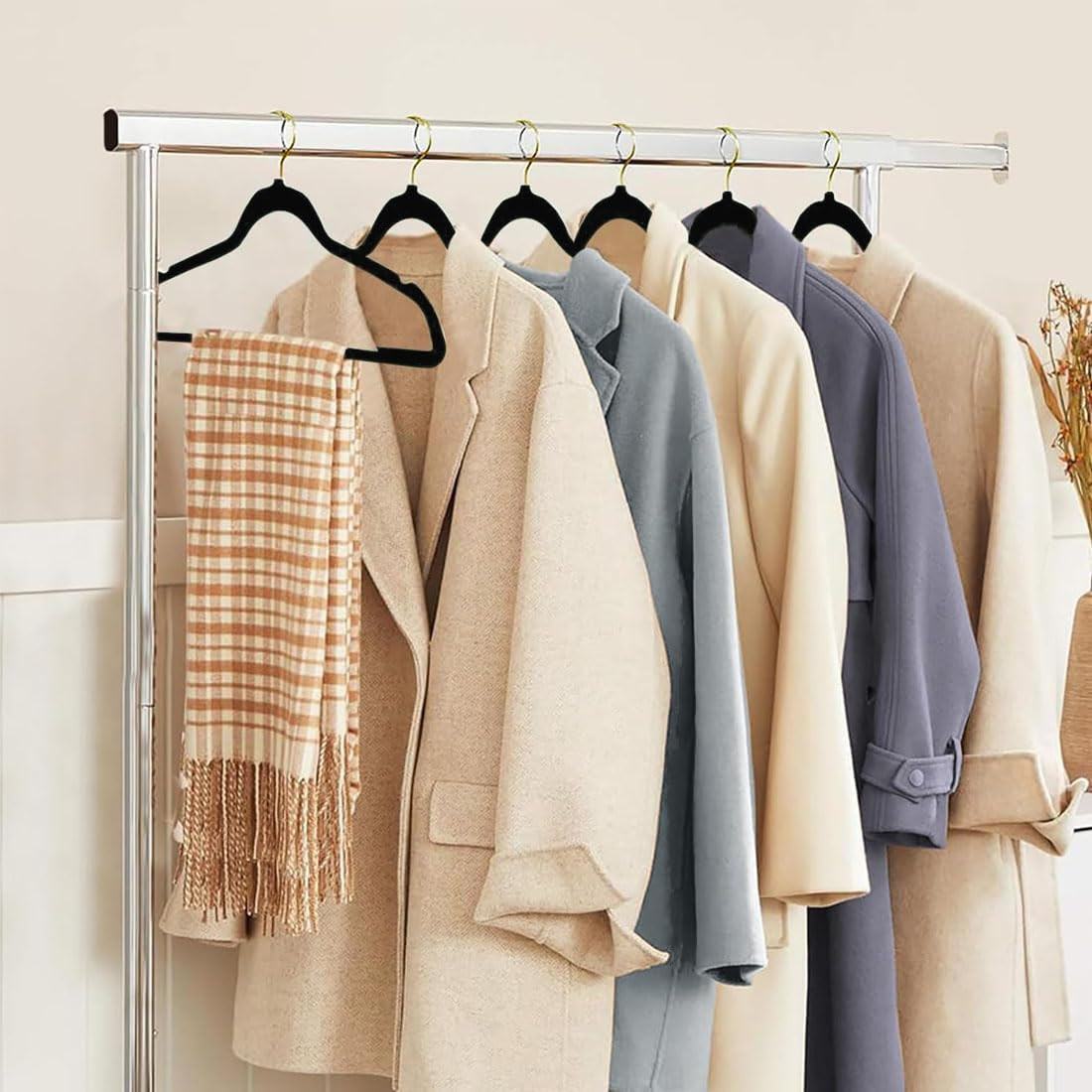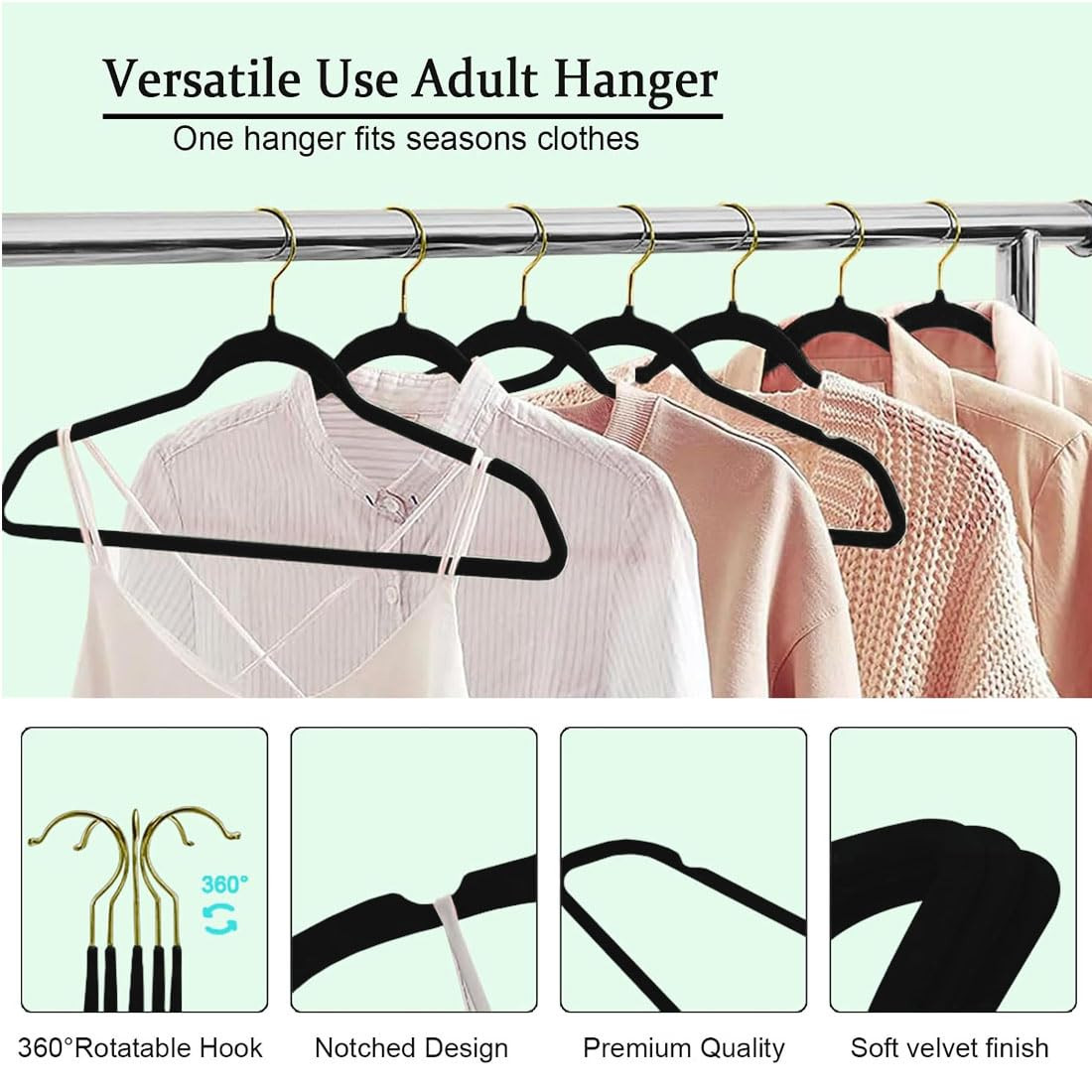 These velvet hangers are a closet game-changer! The soft non-slip surface keeps delicate fabrics secure without stretching or scratching, while the shoulder notches easily hold strappy tops and dresses in place. The 360° swivel hooks make organizing a breeze, and their slim design saves so much space—perfect for small closets! Love how they keep everything neat and wrinkle-free.
