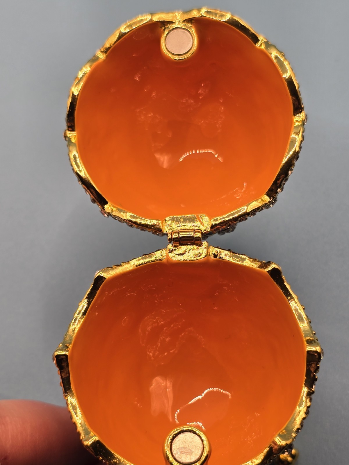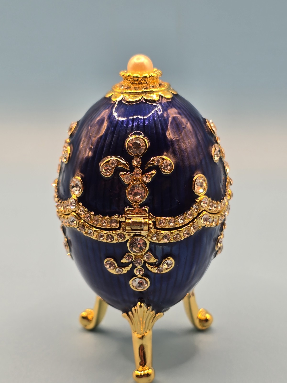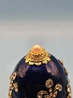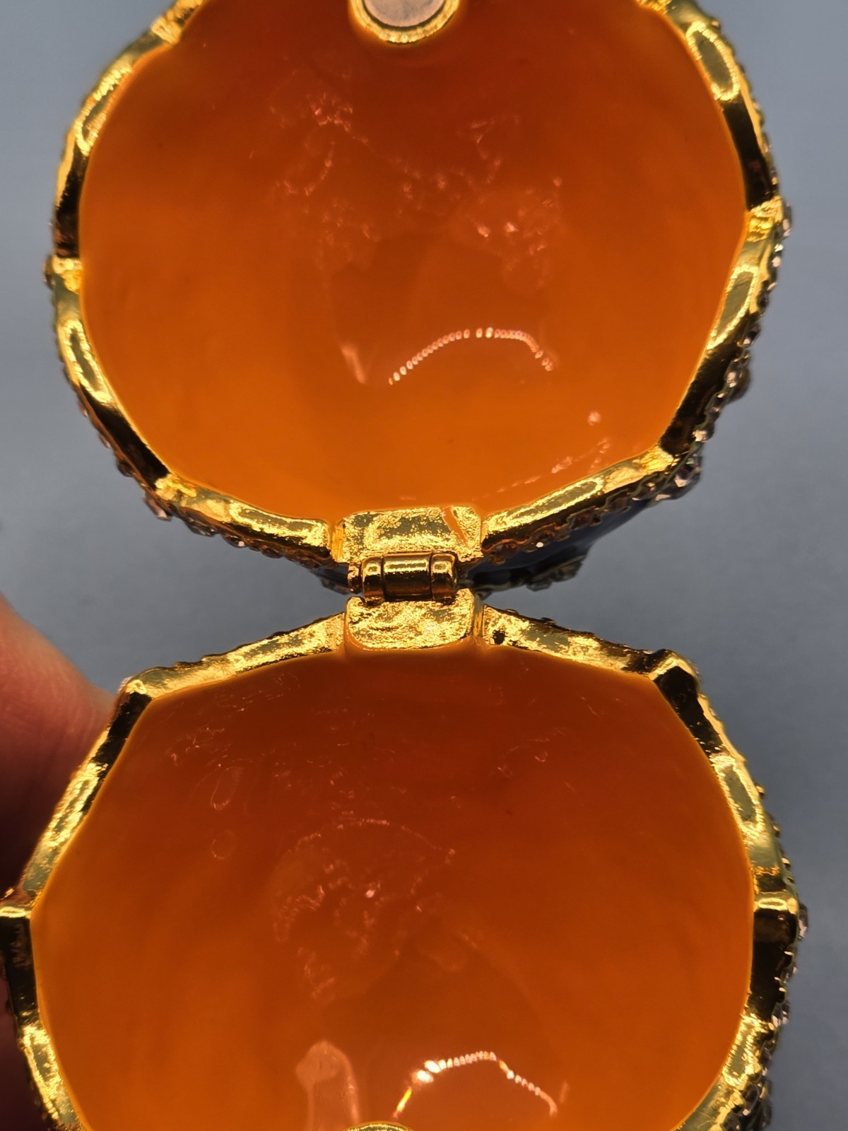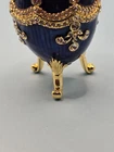 Decorative jeweled egg trinket box featuring a deep blue enamel finish with gold-tone metal accents. The exterior is embellished with clear rhinestones and topped with a faux pearl cabochon. The egg opens via a hinged design and stands on ornate gold-tone feet. The interior is lined with orange satin-style fabric and includes molded inserts suitable for holding a small ring, earring, or keepsake. This piece is decorative in nature and intended for display or light jewelry storage. Details Color: Blue with gold-tone accents Materials: Metal alloy, enamel finish, rhinestones, faux pearl Hinged opening Stands on decorative feet Includes presentation box shown in photos Condition Pre-owned. Overall good cosmetic condition with minor signs of wear consistent with age and handling. No chips or cracks observed. Rhinestones intact. Please review all photos carefully, as they are part of the description. Notes This item is a modern decorative trinket box. It is not antique and not made of precious metals or gemstones. Ships carefully packaged to ensure safe arrival.