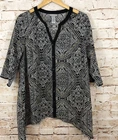 Catheirnes womens size 0X black print shirt top blouse cutout neck detail asymmetrical sharkbite hem button front 3/4 sleeve easy relaxed silhouette 95 cotton 5 spandex Gently pre-owned no flaws Measures approx: armpit to armpit: 23" length: 29"-34"