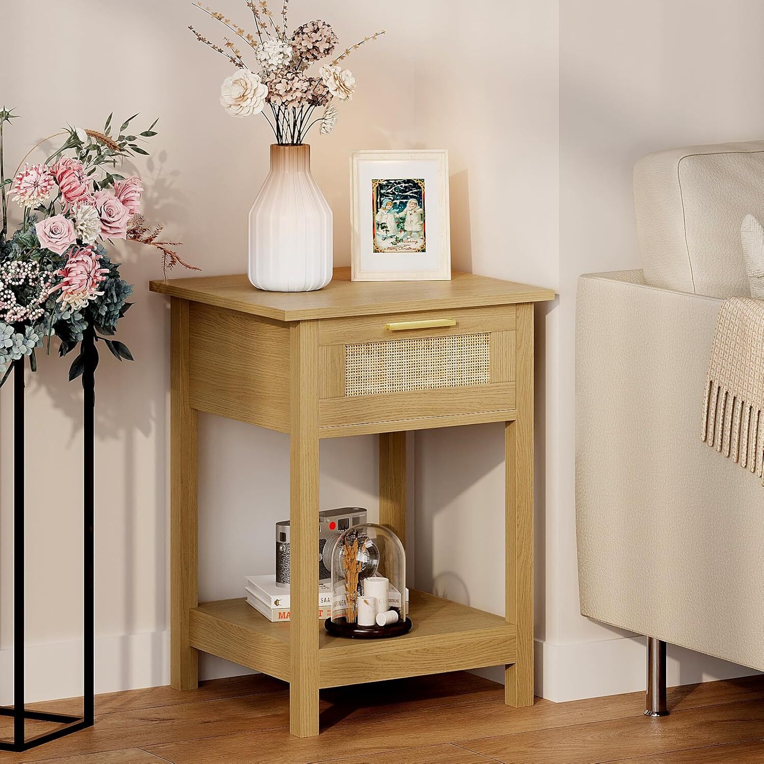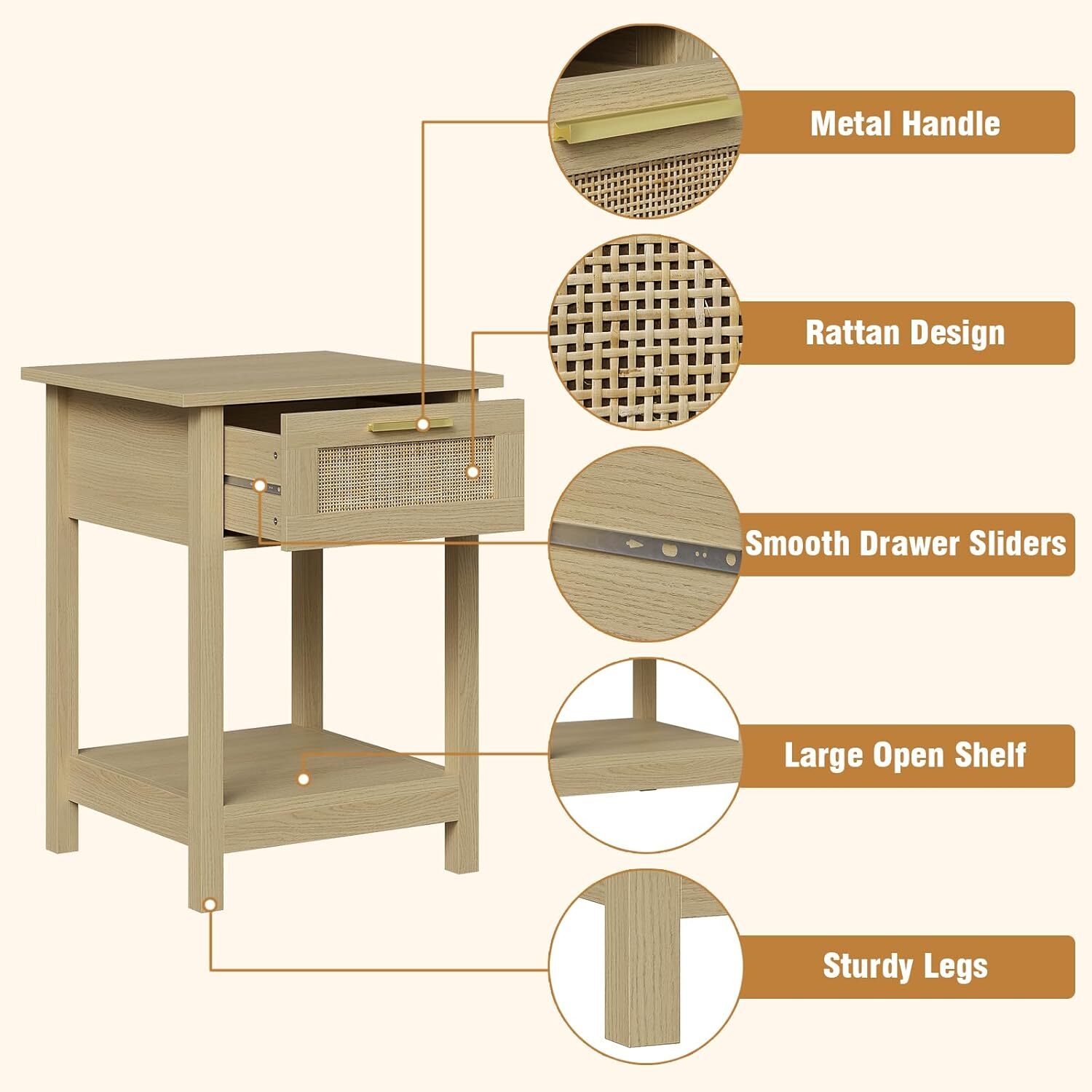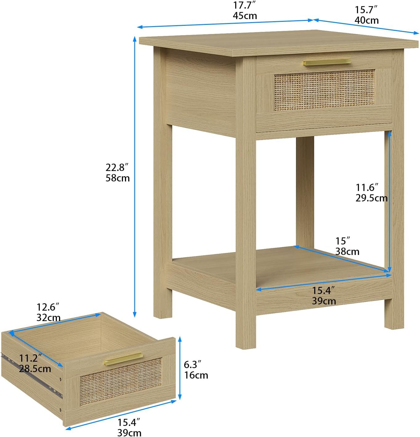 Product Description Rattan Nightstand with Drawer and Shelf for Bedroom This nightstand features a natural wood grain and rattan drawers,matches well with stylish,rustic,country or farmhouse furniture decoration style.It adds a touch of elegance to your living space Rattan Bedside Table with Drawer for Living Room Product Details Boho Bed Side Table for Bedroom Boho End Tables Side Tables with Storage Shelf for Small Space