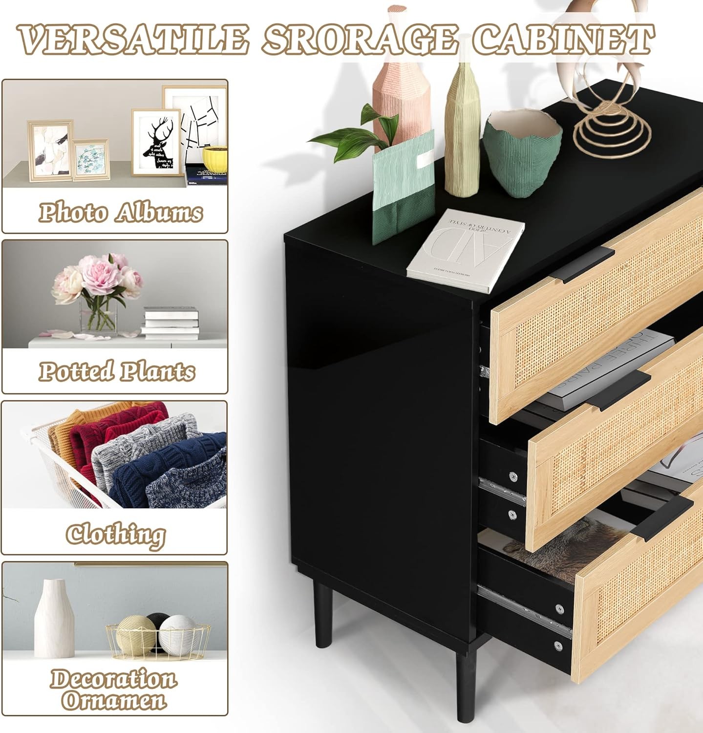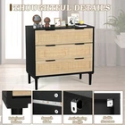 Rattan 3 Drawer Wood Dresser Boho Large Storage Cabinet Nightstand Chest for Bedroom Mid Century Modern Chest of Drawers Wide Closet Dresser Storage Organizer Product Description About this item 【3 Large Drawers & Double Handles】:This 3 drawers chest has multiple storage options for you to choose from,which is abundant and spacious enough to meet your daily storage needs.It features 3 ample drawers, which can be used to store books, remote controls, keys, glasses and other daily necessities, or T-shirts, jeans and other.Each drawer is equipped with two handles for easy access.Desktop also provides a storage platform for lamps, alarm clocks and decorations for convenience. 【Exquisite Rattan Dresser】:Our 3 drawer wood dresser adopts the classic black and wood color contrasting design, each drawer is decorated with natural rattan, blending the retro style of the mid-century and the stylish modern elements, simple yet exquisite, perfect for all styles of decoration. 【Multifunctional】:Multifunctional dresser has the perfect size and can be used as a sofa side table next to the sofa, as a storage cabinet in the hallway or as nightstands next to the bed.It will keep your home organized and tidy,making it easier for you to get things. 【Premium Material & Sturdy】:The bedside storage cabinet with drawers is made of high-quality wooden frame and hand-woven rattan,so it has exquisite workmanship and smooth surface.Four legs are thickened to improve load-bearing capacity and stability, sturdy and will not shake, strong enough to withstand itself and the items placed. 【Easy to Assemble & Clean】:Comes with detailed and easy-to-understand instructions and complete accessories, including non-slip feet and four anti-tip corners. Each part is numbered, so you can fast and easy to assemble without spending too much time and effort. Only need a simple wipe for simple daily maintenance.