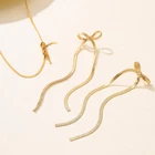Bow Dangle Choker Necklace Set for Women Long Tassel Chain Earrings Dainty Gold Snake Chain Necklace Wedding Prom Fashion Jewelry Set Gifts Product Details Product Dimensions : 3.15 x 2.36 x 0.2 inches; 0.32 ounces Department : womens Date First Available : November 23, 2023 Manufacturer : Yewkit Brand, Seller, or Collection Name: Yewkit Metal stamp: 18k Metal: titanium and platinum Material: Brass Gem Type: No Gemstone Item Length: 3.15 inches Clasp: Lobster Clasp